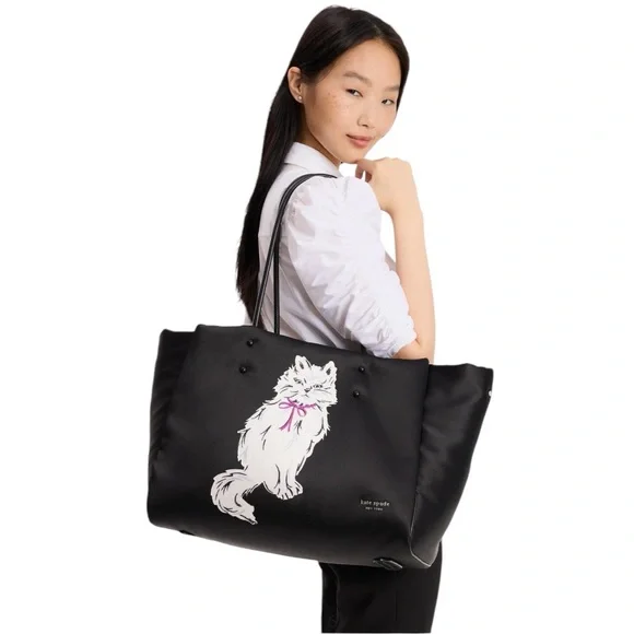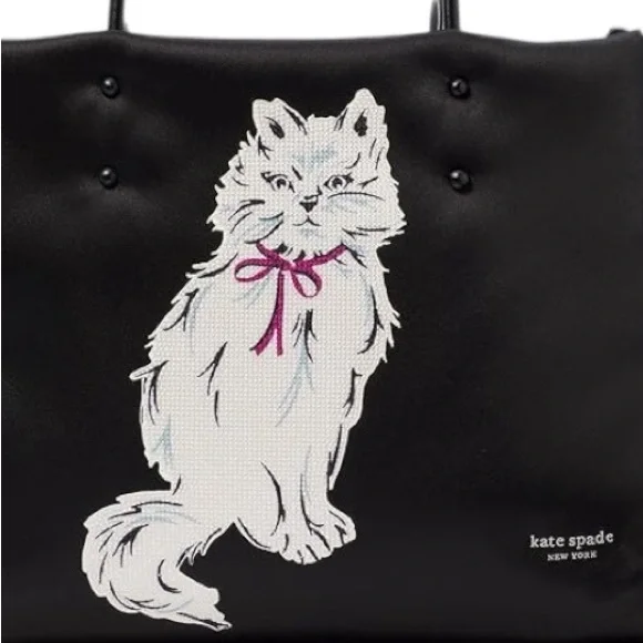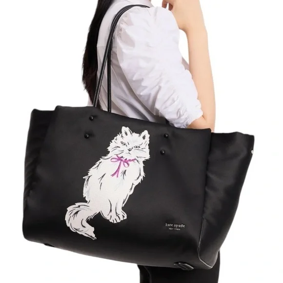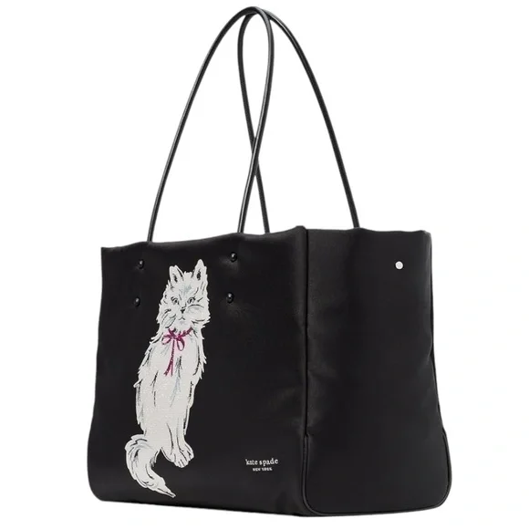 100% Authentic (Guaranteed!) Brand New with Tag NWTOrganize your day with a little meow-wow with this smooth tote featuring a roomy interior and pockets that keep everything you need neat and close at hand. A crystal-embellished cat motif brings signature style to the front of this bag. Featuring a spacious silhouette with a sparkling companion, the long handles fit perfectly over your shoulder.Large-sized bag: 16-9/10"W x 10-1/4"H x 6-7/10"D (width is measured across the bottom of handbag)11-1/5"L handles Open top Silver-tone hardware, crystal embellishments, interior zip & slip pockets Tablet compatible (std. size 8"-10") Fits A4 binder, 13" laptop etc.PolyesterTrim: leather Spot cleanStyle number: KI565Bundle to Save! Check out many other bags totes satchels backpacks weekenders wallets wristlets crossbody purses cosmetic cases iPhone cases earrings necklaces rings beach towels bath hand towels washcloths towel sets shoes boots booties lace up slip on slippers socks sandals shorts pants tights leggings pjs joggers loungers tees tanks blouses pillows mats rugs jackets windbreakers swimsuits goggles hats throw blankets comforters sports bras underwear briefs bikinis sleepwear sleep shorts shirts in my Closet. Thanks!
