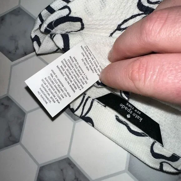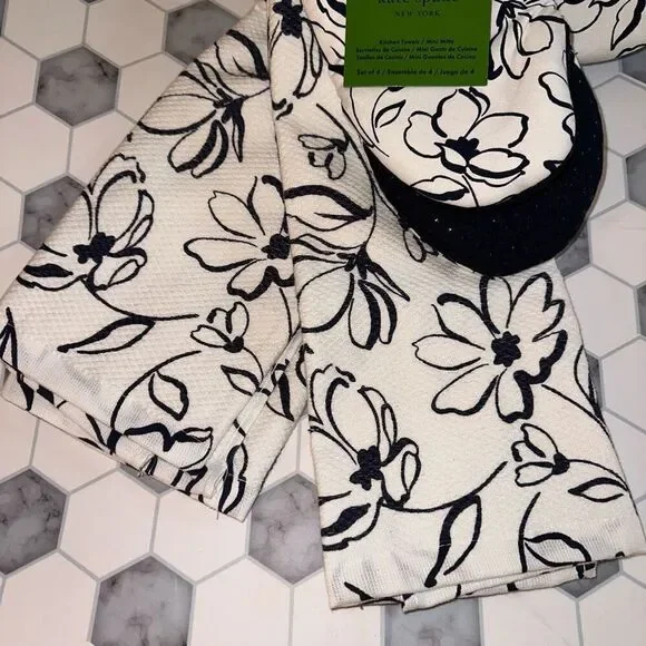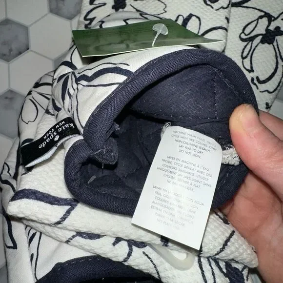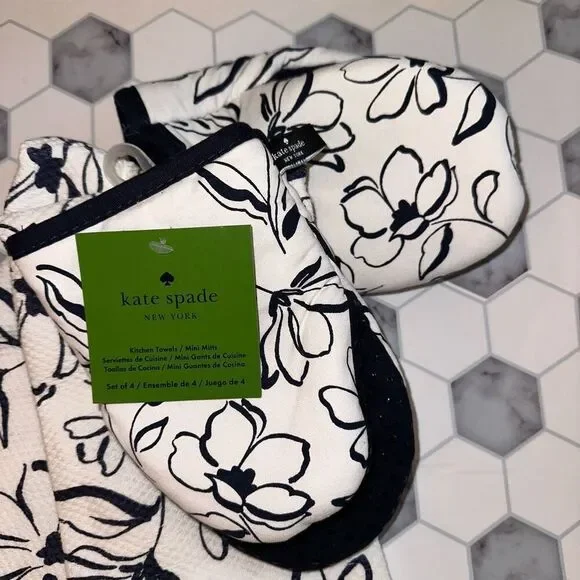 Kate Spade New York Set of kitchen linens 4 pieces total White background Navy blue brush stroke floral pattern NWTIncludes: 2 mini oven mitts - 100% cotton - machine wash cold; lay flat dry - silicone grips - logo loops - 5.5 x 8”2 kitchen / dish towels - 100% cotton - machine wash cold; tumbler dry low - 17 x 28”Smoke free, cat friendly home