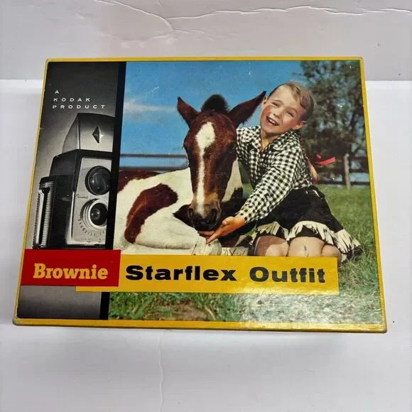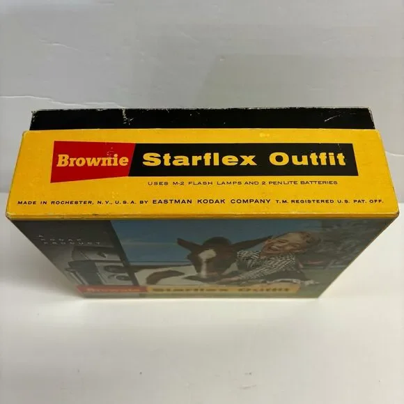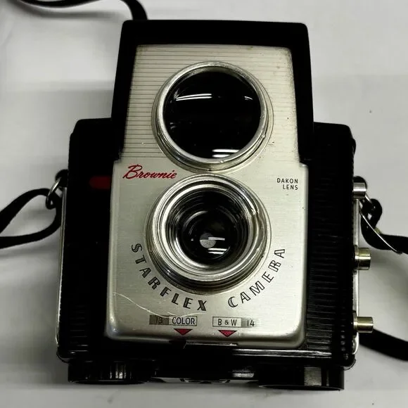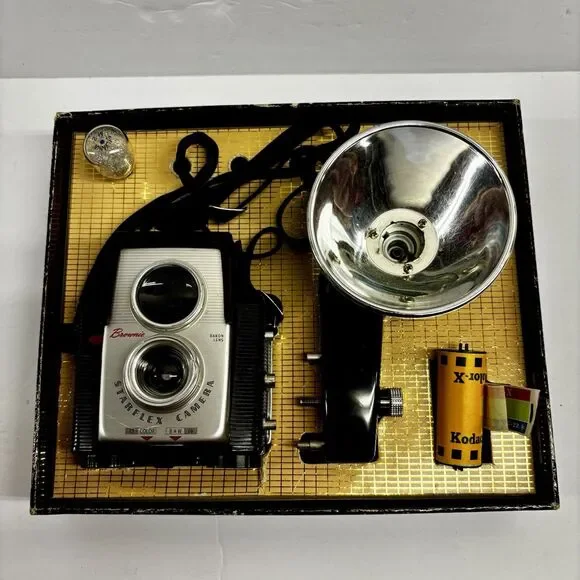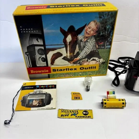Capture the essence of vintage photography with the Kodak Brownie Starflex outfit camera model 25L. This classic black camera hails from the United States, a testament to the era when every snapshot was a momentous occasion. The Starflex designations refer to its unique ability to accommodate a range of photography outfits, making it a versatile choice for enthusiasts and collectors alike. Included with the camera is the original flash bulb, ensuring that you can illuminate your subjects to perfection.Note: Camera is gently used and has not been currently tested. You will receive everything pictured.Open to offers these items come from a smoke free home.Items will be shipped in 1-2 business days.
