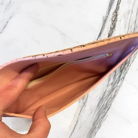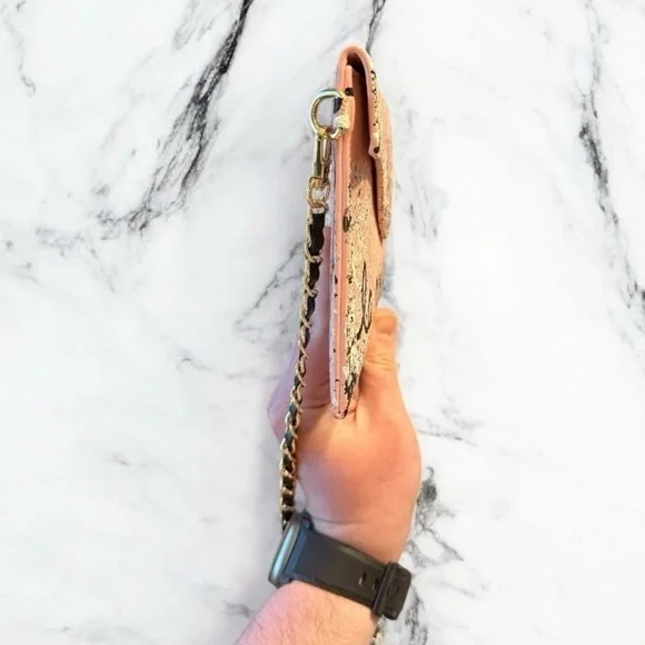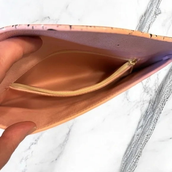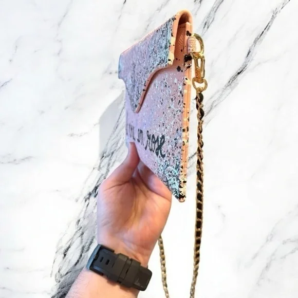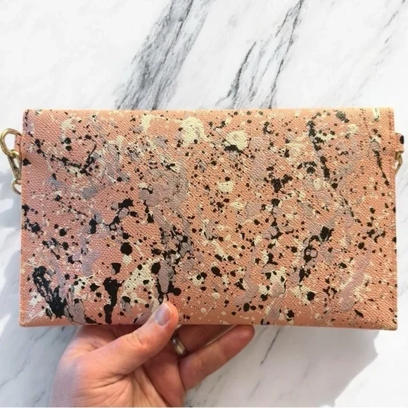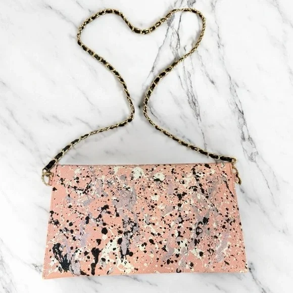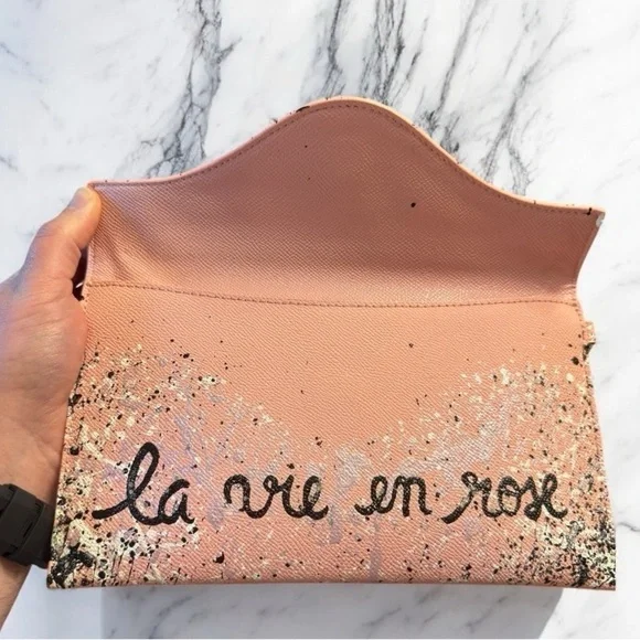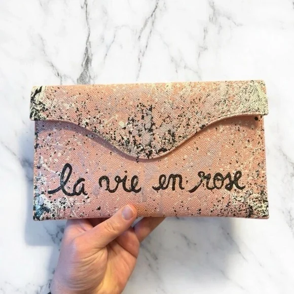 Boutique, hand-painted crossbody clutch created by a Detroit-based artist during the 2017 Arts, Beats & Eats Festival. This one-of-a-kind piece features a blush pink base with abstract splatter paint and the phrase “la vie en rose” — French for “life in pink” or “seeing life through rose-colored glasses,” symbolizing love, beauty, and optimism.Crafted with care, it includes a removable gold-and-black rope chain long enough for crossbody wear. Finished with a structured envelope flap and secure magnetic closure.•Brand new, never used•Artist-designed and painted by hand•Fully lined interior with zip pocket•Detachable crossbody-length chain•Ideal for collectors or statement-makersSold as is no cancellations or returns.