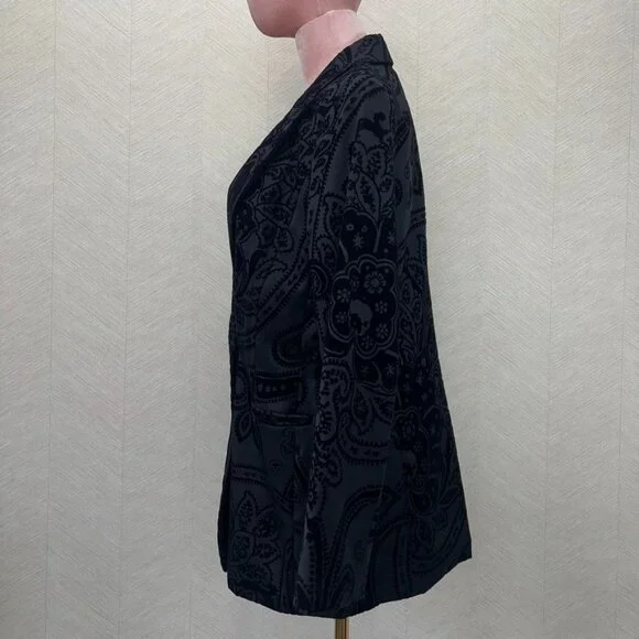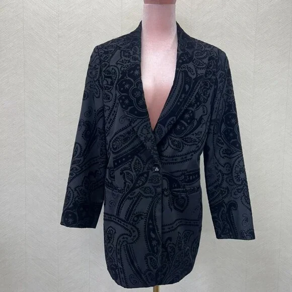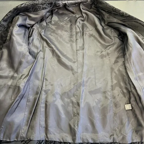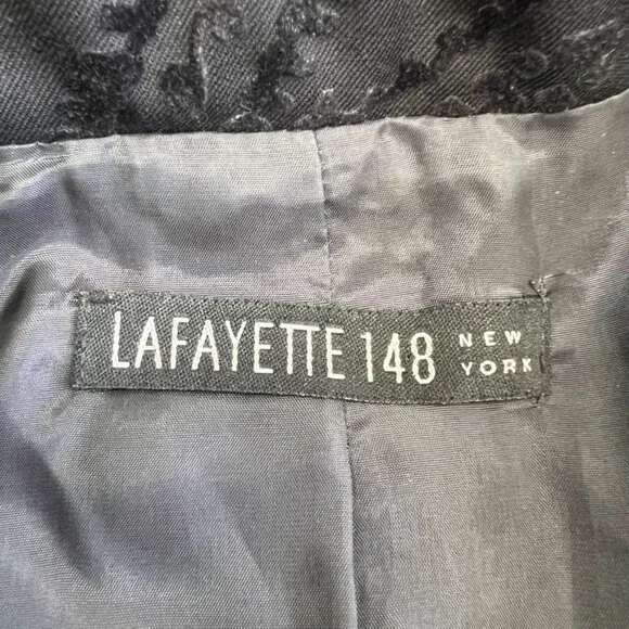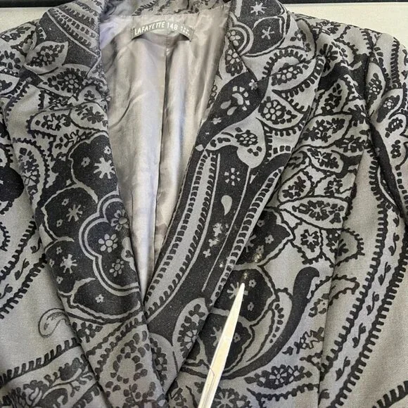 Lafayette 148 Woman’s Black 100% Wool Paisley Velvet Brocade Floral Blazer Size 101. Measurements=* ~Length: 30”* ~Chest: 19”* ~Armpit to Hem: 16”* ~Shoulders: 16”* *measured laying flat** Great condition, like new* 100% wool* Dry clean only ***neeeds a cleaning, has some marks (that will definitely come out)* Some wear on the velvet areas (hard to tell)* Tiny shoulder pads to give some structure~~Thank you so much for checking out my shop! I'm open to many reasonable offers—and hey, sometimes even the wild ones make the cut. Don’t hesitate—shoot your shot!~~+Every item is carefully packed with shipping in mind, and record the packaging process to ensure everything is handled with care!+