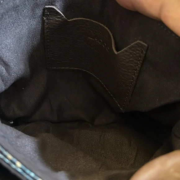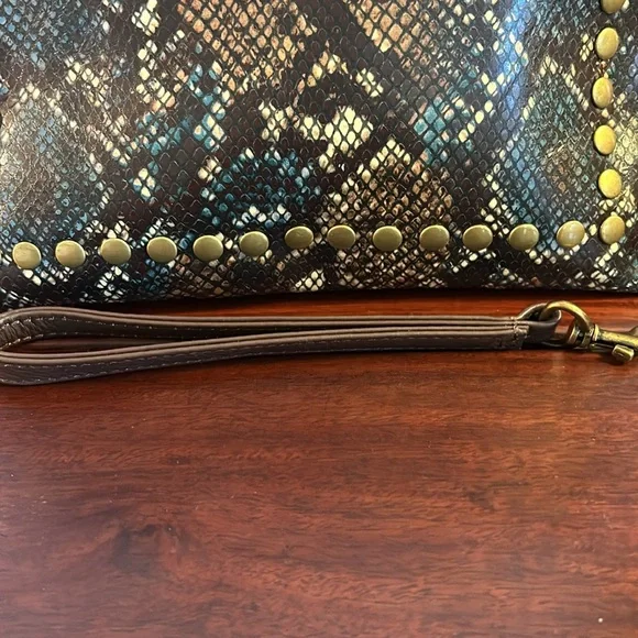 Gorgeous snake embossed leather with accented studs. Removable adjustable strap as well as wristlet strap included. Very clean inside and outside. 3 sectional compartments. Interior pocket. Dimensions are approximately 6.5”Hx9”L. Please see pictures. This bag is in very good preloved preowned condition. All reasonable offers considered.