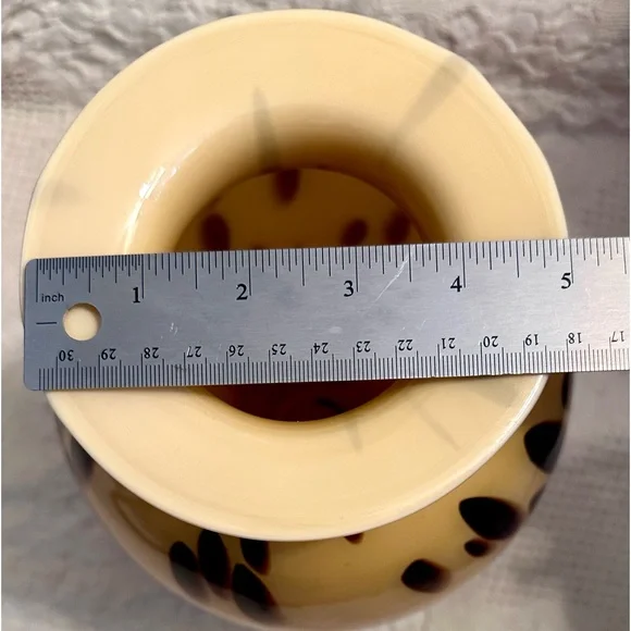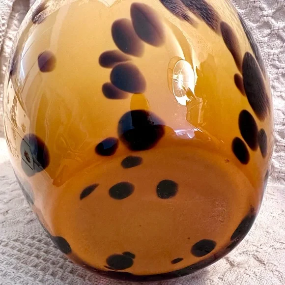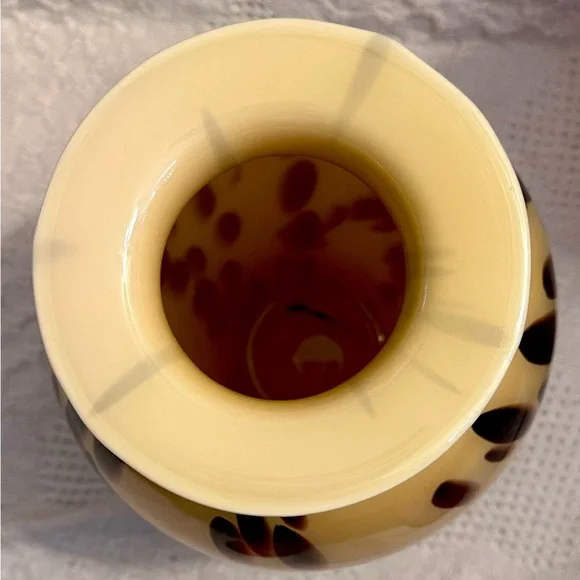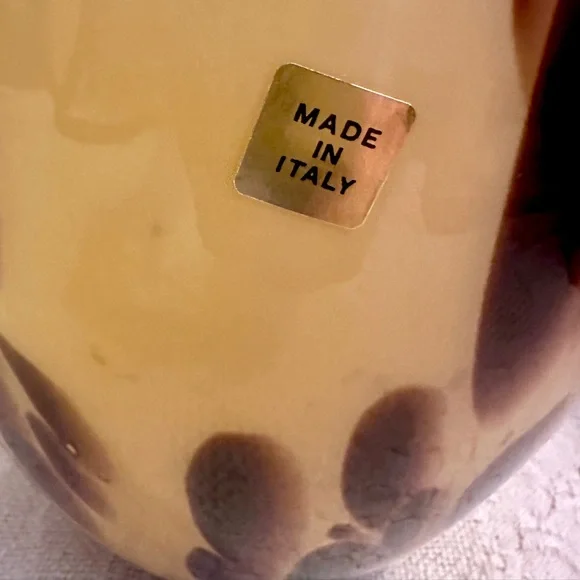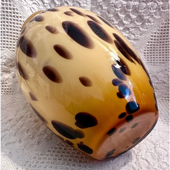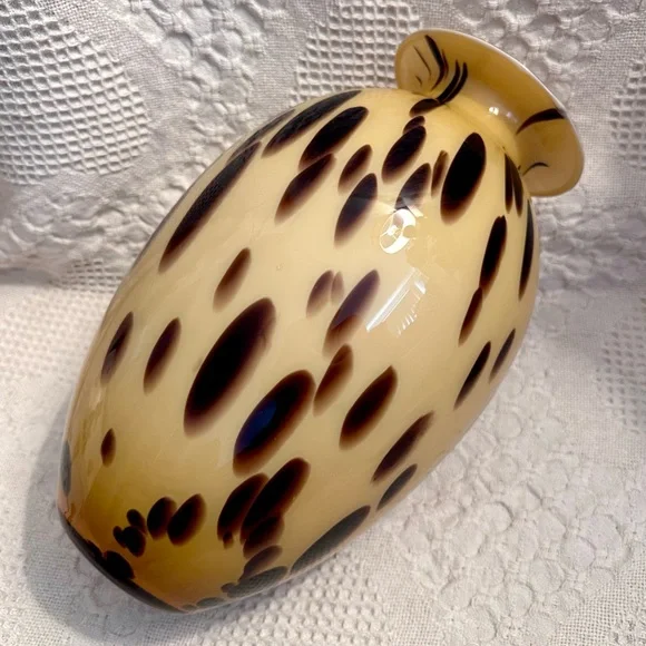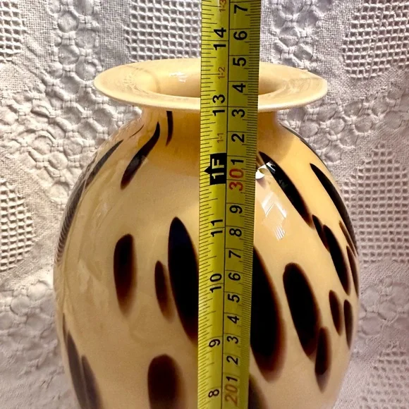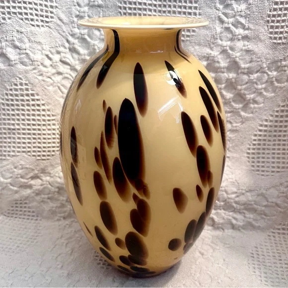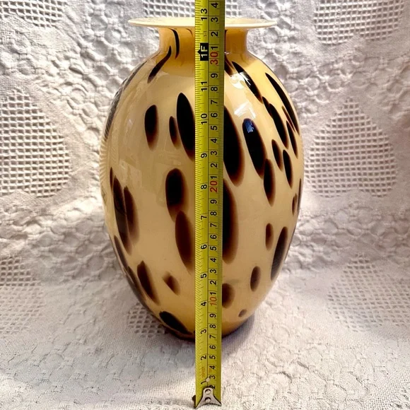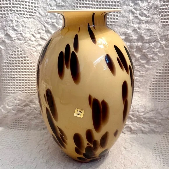 This exquisite vase is a beautiful decorative piece that would make a stunning addition to any room. Handmade in Italy with the finest quality glass, this Murano vase features a unique spotted pattern in beige and brown. The glossy finish adds to its elegance and charm.At 13 inches tall and approximately 5.3 inches wide at the mouth, this vase is perfect for displaying your favorite flowers or for use as a standalone statement piece. With its Italian heritage and artisanal production style, this Maestri Vetrai vase is a must-have for any collector of art glass. No chips or cracks.
