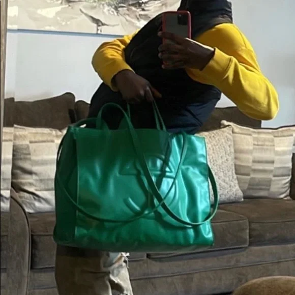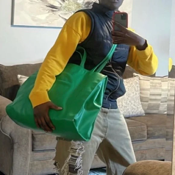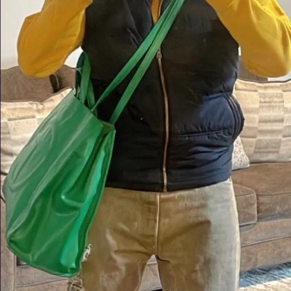 The iconic Unisex Shopping Bag is an Everyday bag for Everyone.Featuring a double strap (handles and cross-body straps), embossed logo, a main compartment with magnetic snap closure, internal laptop-sized compartment with zipper closure in back and additional internal pocket in front. Made from faux leather and twill lining. Bag is packaged in a 100% cotton drawstring bag with screen-printed logo.Large fits a long weekend and is the ultimate carry-on.(Height 14 1/4", Width 19 1/4", Depth 8", Drop 21")ships immediately no wait timeGreat condition. Worn less than 10 times! Amazing for luggage or travel as well! Direct Message me for details and questions!