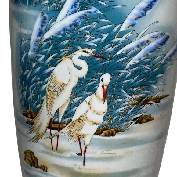 This is an absolutely stunning table vase with a beautiful painting of cranes and snow and the moon.There is a Poetry on the back, but I cannot read it.This is a centerpiece vase, it’s approximately 17 inches tall and 5” base, 6” top rim and approximately 8” at widestPerfect for Gladiolas!• Marked- Jingdezhen Jiangxi China 鎮景 製德• Very Good ConditionProvenance-They were in an abandoned Scottsdale locker buyout with many vintage and some antique Asian pieces.