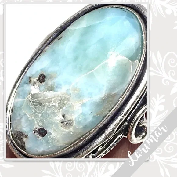 Larimar Eclectic Silver Artisan Ring, Size 7.5 (Light to Pale Aqua Blue, Charcoal, White)Fabrication:Artisan handcrafted, handmadeMetal:Plated Sterling Silver 925Features:Shadowbox styling, multi-tiered trim, smooth bezel, scroll accentsMain stone:Larimar, large oval shape (Light to Pale Aqua Blue like the Caribbean Sea from where it originates, Charcoal Grey, White)Main stone treatment:NaturalStyle:Boho, gypsy, festival, eclectic, ethnic, Bollywood, bohemian, hippieSize:7.5Created in / purchased from:Jaipur, India🤍 Additional Larimar designs also available in many styles! 🤍🤍 From my worldwide collection of new & vintage eclectic, boho treasures. Favorites include chunky designs from India & Native American pieces. Been collecting for decades, more to come! 🤍Q32476