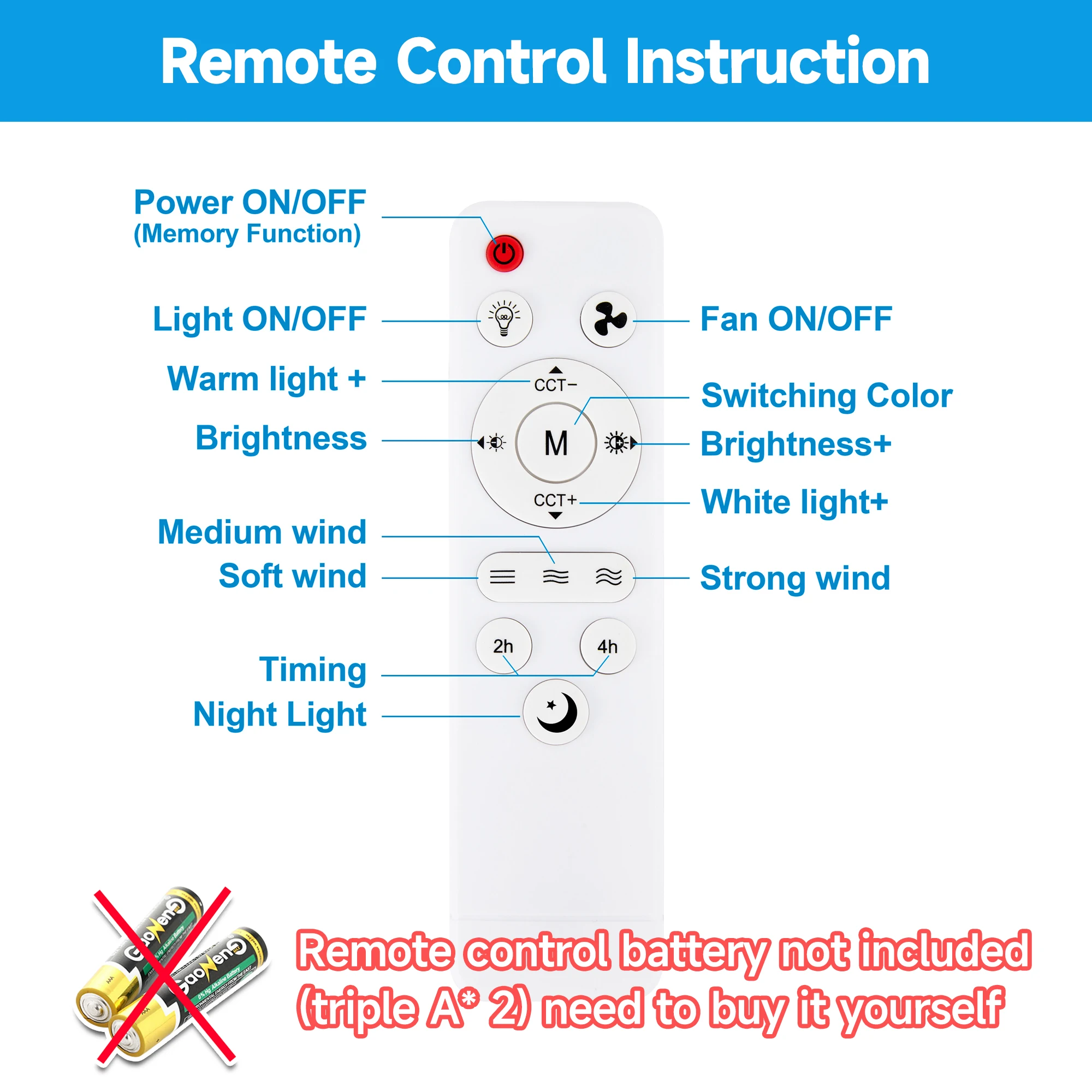 Remote control battery not included(triple A* 2) need to buy it yourself