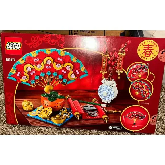 You are purchasing a LEGO Spring Festival-Chinese Festival-Good Fortune Building Set. This LEGO Festival features objects that symbolize a future filled with prosperity and joy. It features a beautiful fan decorated with 2 magpies flying above a branch of spring blossoms, a vase of fortune red fruit, persimmon fruit, golden ingots and a calligraphy pen with a scroll showing "spring " Chinese text. Customized this set with 2 options for the fan (instructions included), and other items that can be removed from the base so that builders can create their own unique, festival decor. This Lego Building Set contains 1021 pieces. It is new sealed in the original box. It comes from a non-smoking home.