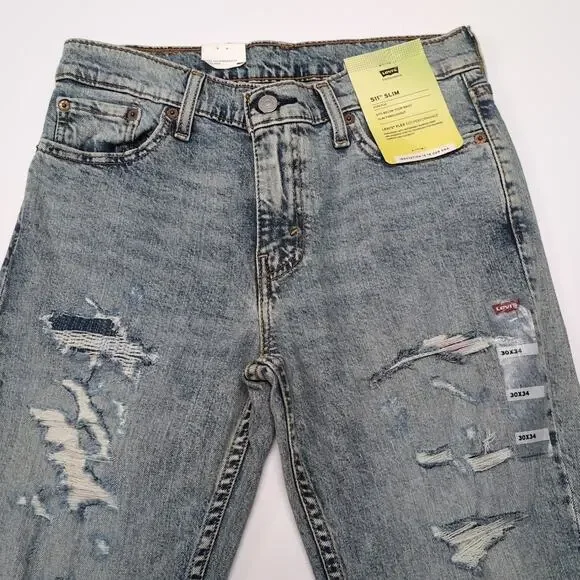 Levis 511 Jeans Mens Size 30x34 Blue Distressed Cotton Blend Slim Fit NEW NWT * Levis Style: 511 * Closure Type: Button & Zipper * Pocket Types: 1 Front Coin Pocket(s), 2 Back Slip Pocket(s), 2 Front Slip Pocket(s) * Pockets: 2 Back Slip Pockets, 2 Front Slip Pockets, 1 Front Coin Pocket * Streamlined fit that's narrow through the seat and thigh * Fiber Content: 70% Cotton, 28% Lyocell, 2% Elastane * Fabric Description: Denim * Inseam: 34 In * Care: Machine Wash, Dry Flat * Jean Style: Slim Fit Jeans