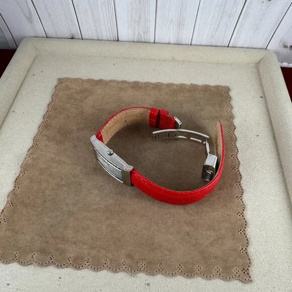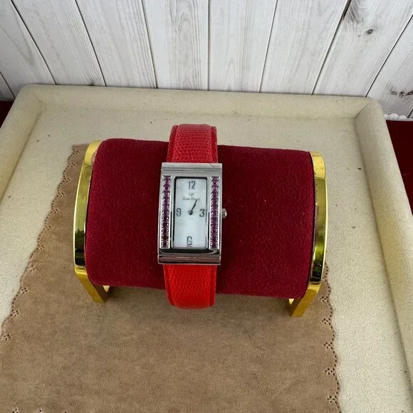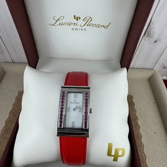 Like Red Red Wine this fine Vintage Lucien Piccard Ladies Rhodium PlatedLab Created Rubys, Mother of Pearl Dial with silver tonenumerals, Silver hands and a genuine 9 inch Red Embossed leather Strap with Deployment Buckel - Movement type is Swiss Quartz - Closure: Deployment Buckle - Adjustable - Red Genuine Fine Leather BandStyle New Never used Lucien Piccard, stainless steel watch.No tags attached; new in boxSwiss made 3ATM Water Resistant Sapphire CoatingL9470RDBox has signs of old age/normal wear and tear