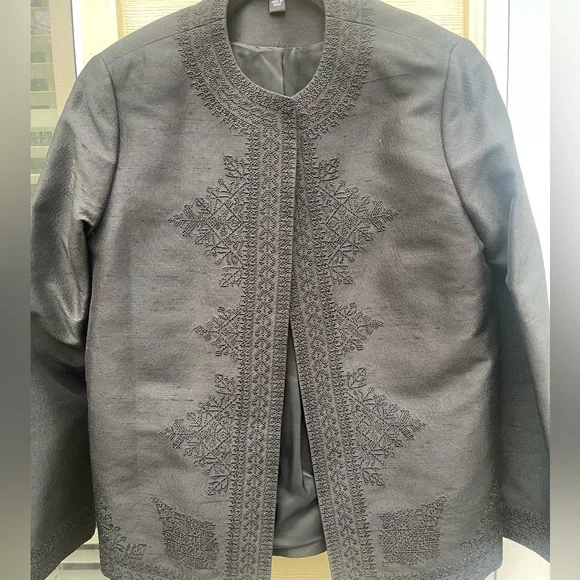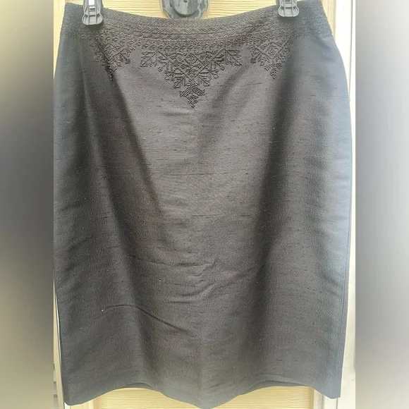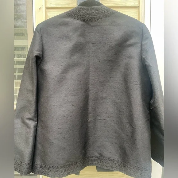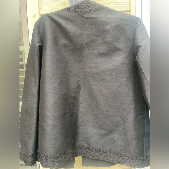 The Linda Allard Ellen Tracy 100% Silk Embroidery Open Jacket Skirt Suit in size 8 is a stylish and elegant outfit perfect for parties, cocktails, or business events. The jacket features long sleeves and a single-breasted design with no button front closure. The skirt and jacket are both made of 100% silk crepe in a solid black color with an acetate lining. This designer suit exudes a classic and sophisticated vibe, making it a versatile and timeless addition to any wardrobe. Care instructions recommend dry cleaning only to maintain its luxurious quality.The jacket has a spot in the sleeve which I have not attempted to remove. Should come out with dry cleaning, Otherwise, suit is in very good pre owned condition. Jacket is oversized, hence the difference in sizing.Jacket length 27”, sleeve 23”, Pit to Pit 22”Skirt length 24”, waist 15”