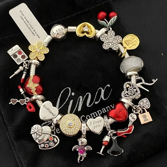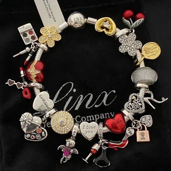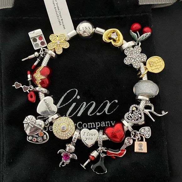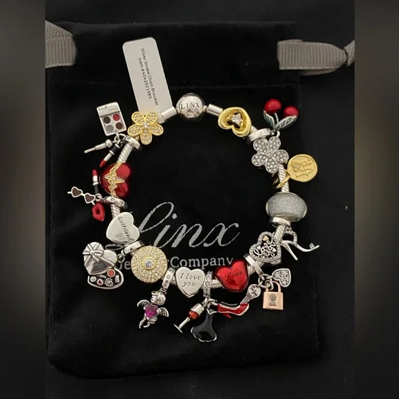 Linx Snake Chain style charm bracelet with a ball clasp, featuring Linx logo.The bracelet comes with 19 Linx charms as shown.*All items are 925 sterling silver and 14k yellow gold over 925 sterling silver.*Linx bracelets and charms are very well made and of superior quality, designed to last. These pieces come with a 100% satisfaction guarantee or your money back.*The bracelet is available in multiple sizes *Additional charms can also be added to the bracelet and the ones included are removable as well. *Linx bracelets and charms are universal meaning the charms can also be worn on most other standard size charm bracelets of different brands and most other charms of standard size will also fit on this bracelet.*All of our items are new, directly from our store and will be delivered in a Luxury, signature Pink, Linx velvet jewelry pouch.*Please add 1 in to the measurement of your wrist in order to allow room for your charms.