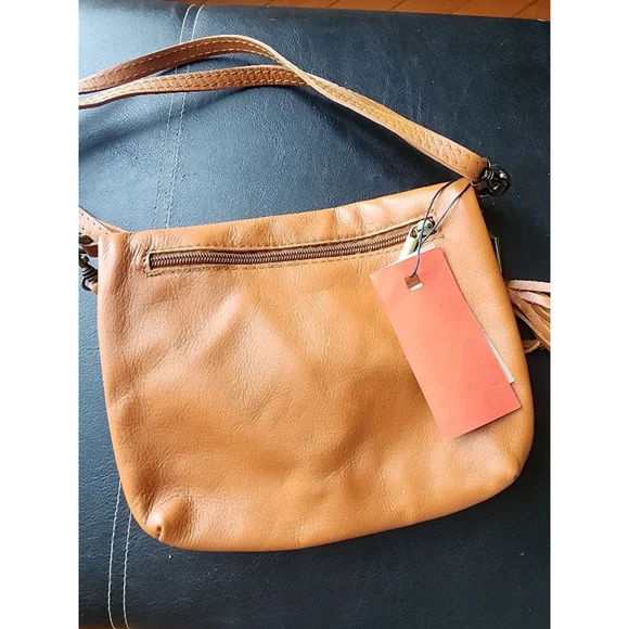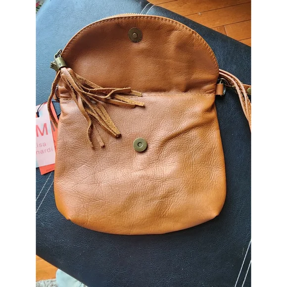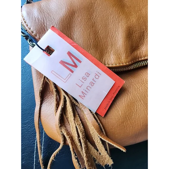 This is a new Lisa Minardi crossbody bag, still with its original tags. The bag is crafted from tan leather and features a top zipper closure, a magnetic snap flap, and a leather fringe detail. The interior is lined with black fabric and includes a zippered pocket. The adjustable strap is also made of tan leather. The bag is in pristine condition, showing no signs of wear.Made in Italy