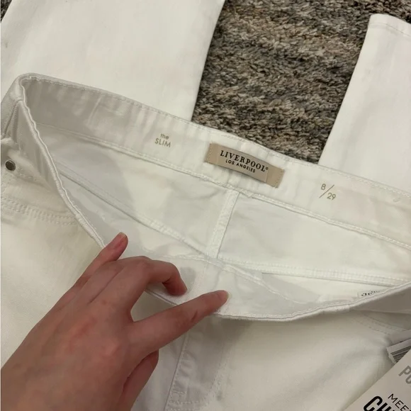 Liverpool Women JeansChloe Pull-On Slim Jeans (slim straight leg jeans)Brand New With TagsSize: 8/29Inseam: 29.5inColor: Bright WhiteThere is a tiny dust mark due to being in storage as pointed out in the images above, it will wash out very easily but as I planned on selling them I didn’t get around to doing it myself!!