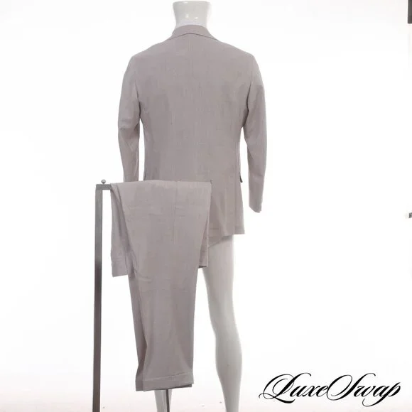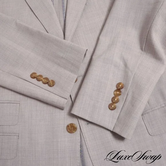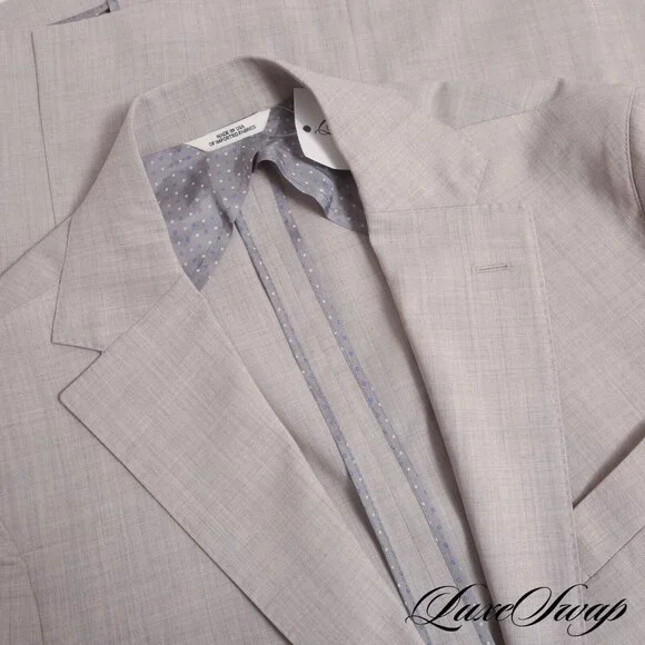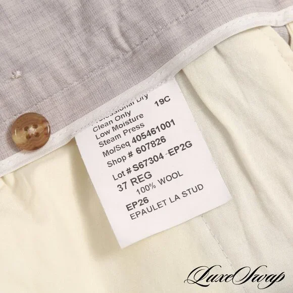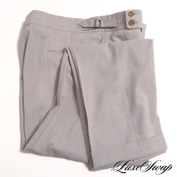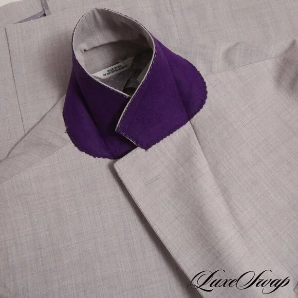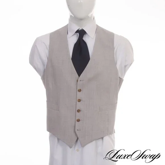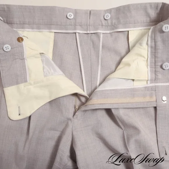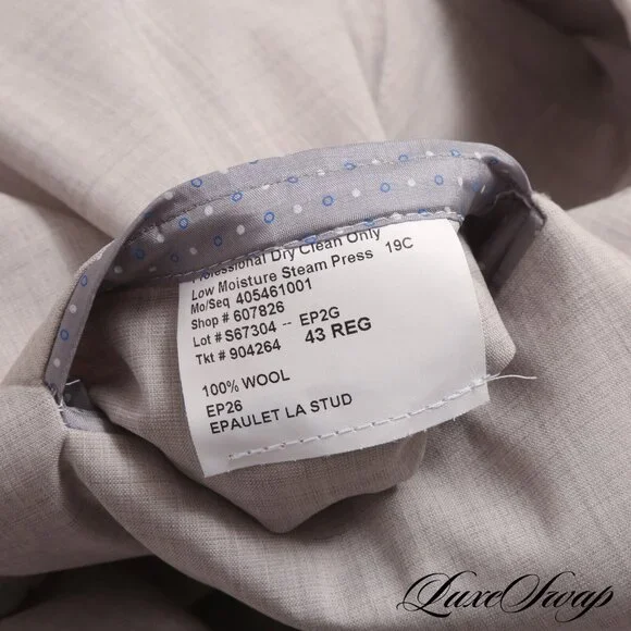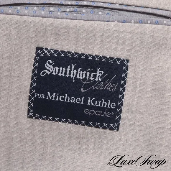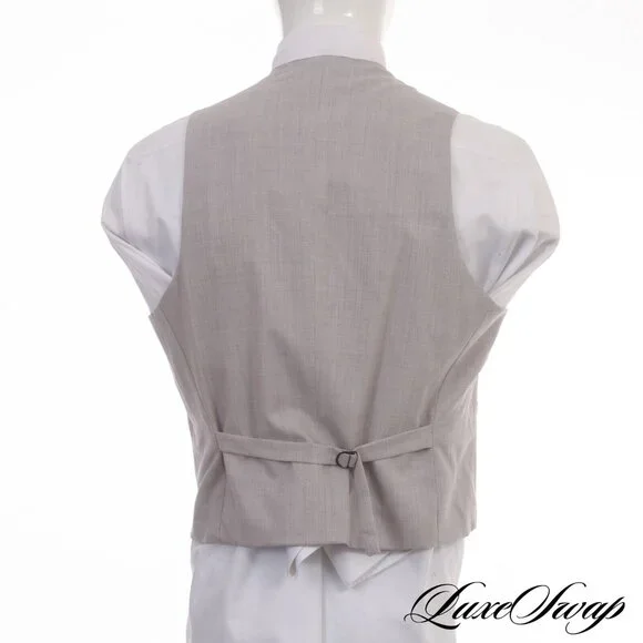 A recent three-piece suit in a tropical gray wool by Epaulet for Southwick. In pristine condition and never wore it myself. Tagged size of the jacket is 43R and trousers is 37W. Jacket features dual rear vents, notch lapels, and two-button front. Trousers feature pleats, cuffs, thick waistband, sewn-in suspender buttons, and side adjusters/tabs. Measurements (taken laying flat):JacketChest (pit-to-pit): 21.5"Waist: 21"Shoulders (seam-to-seam, front): 18"Sleeves (from shoulder seam): 24.5"Length (base of collar to hem): 30"VestChest (pit-to-pit): 20.5Shoulders (seam-to-seam, front): 11.5"Length (top of collar to hem): 23"TrousersWaist: 35" + 2"Inseam: 29.5" + 1.5" (cuffs) + 1" (folded under)Leg opening: 8"