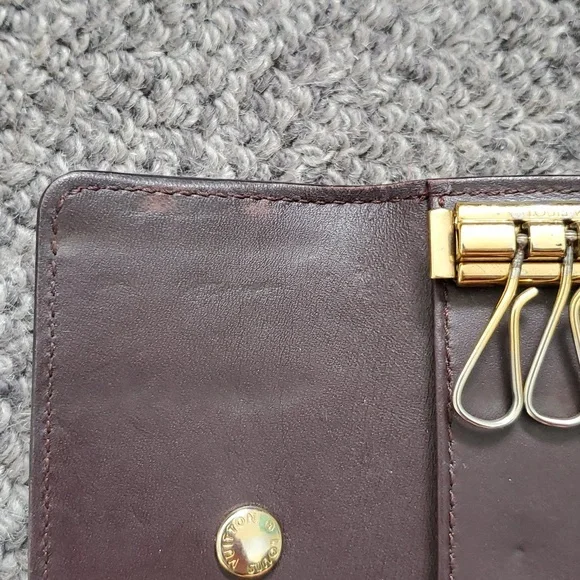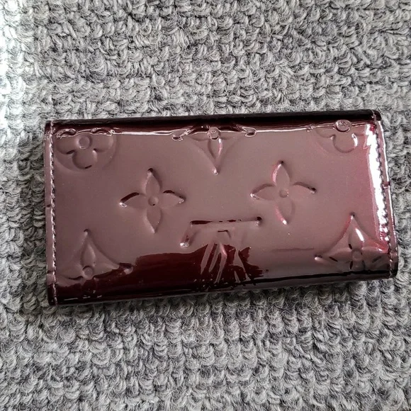 Item offered as pictured. Gently used, this Louis Vuitton Amarante Vernis Multicles 4 Key Holder will be your new favorite accessory. It holds four keys on shiny brass hooks. An ideal accessory to slip into a handbag or pocket to keep your keys from getting lost! Retail price is $290.The Louis Vuitton Monogram Vernis line was first introduced in 1998. In French "vernis" means varnish which explains the shiny and sparkly effect of the bags. It is a monogram embossed coated leather which is like patent leather and has been released in many different colors throughout the years.