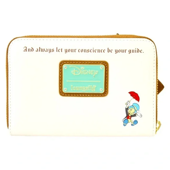 Product DetailsTurn back the clock to enjoy a favorite animated moment in a brand-new way. Carve out some time to accessorize with our exclusive Loungefly Disney Wonder-Con Pinocchio Cuckoo Clock Zip Around Wallet. On the front, applique details bring Geppetto’s cuckoo clock to life, with the roof of the house of the clock peeking up over the top. Below, you’ll find the face of the clock, with hands that move! Pinocchio, who is just outside on the front step, reaches for Figaro while Geppetto places a feather in his cap. The words “And always let your conscience be your guide” appear on the reverse side. On the inside, you’ll find 4 slots for holding cards and 1 clear slot for displaying your ID. It’s the perfect accessory for carrying your valuables while at a convention—or for turning everyday outings into timely adventures. Act fast to collect this 1,000-piece limited edition Loungefly exclusive.The Loungefly Disney Wonder-Con Pinocchio Cuckoo Clock Zip Around Wallet is made of vegan leather (polyurethane). Wallet zips closed, has sturdy antique gold-colored metal hardware and features applique and printed details. Take note of the coordinating pattern of the inside lining fabric.This wallet is an officially licensed Disney product.Wallet Dimensions: 6”W x 3.75”H (Width is measured across the bottom of the wallet.)SKU: WDWA2511Category: Sale Handbags & WalletsLicense: DisneyExclusives sold within the U.S. maybe available in other territories with select partners.