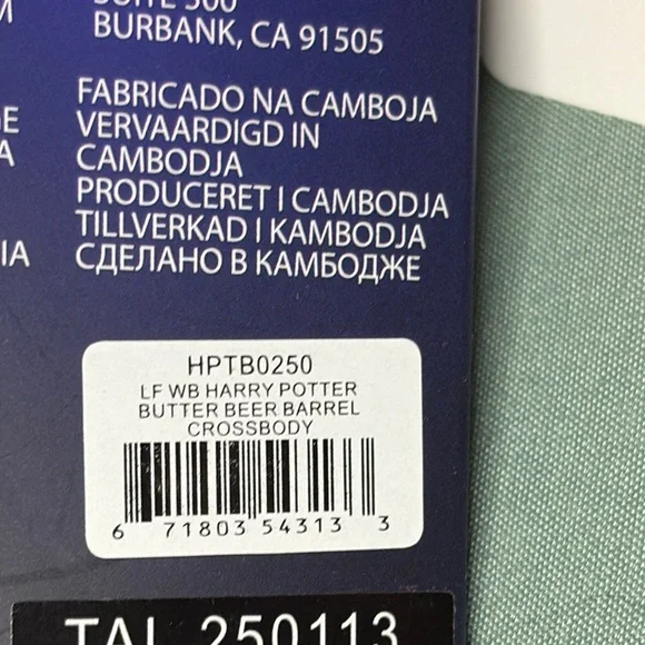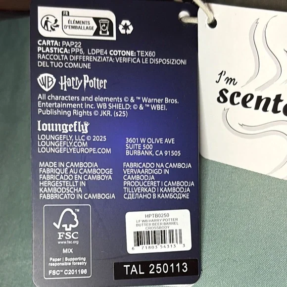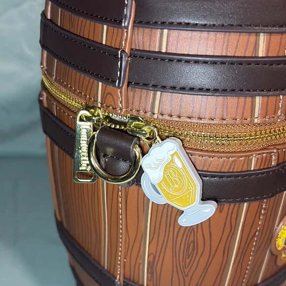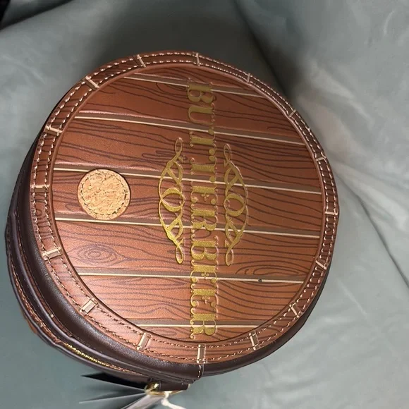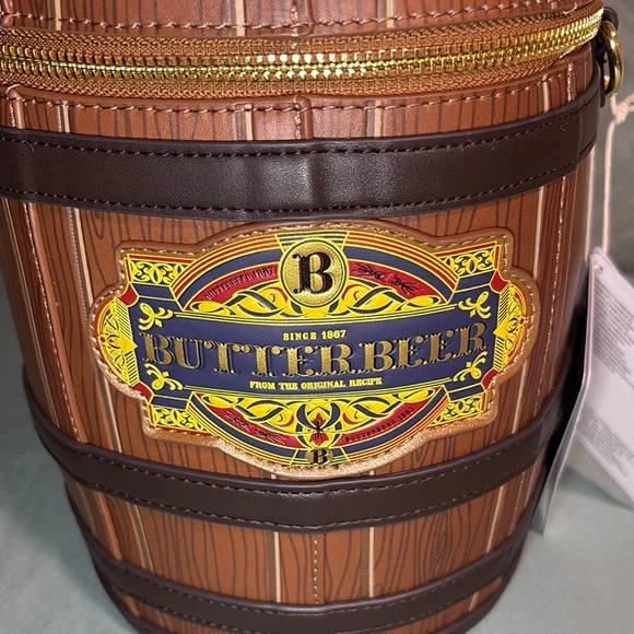 Brand new with tags! This rare Loungefly x Harry Potter Butterbeer Barrel crossbody bag features a whimsical figural design shaped like a butterbeer keg. Crafted from faux leather with printed woodgrain details and chocolate trim, this bag is topped with a faux cork lid and “Butterbeer” printed in gold foil.The gold-tone hardware includes a zipper with a custom beer mug charm, and the interior is softly scented like butterbeer! Adjustable strap included. Loungefly style code HPTB0250 with original tags and barcode.🎁 Officially licensed by Warner Bros🎁 Rare figural collector piece – scented!🎁 Vegan leather, round barrel design🎁 Approx. 9.7” W × 7.5” H × 7.5” D🎁 Made in Cambodia, 2025 releasePerfect for collectors, cosplay, or everyday wizarding fun!Condition:New with tags, never used.