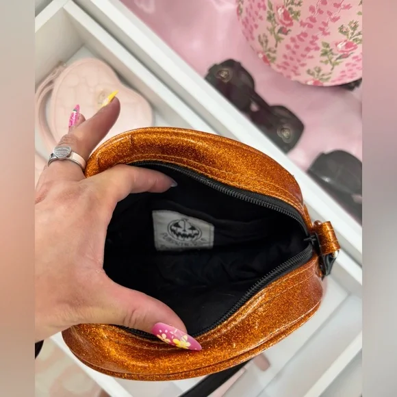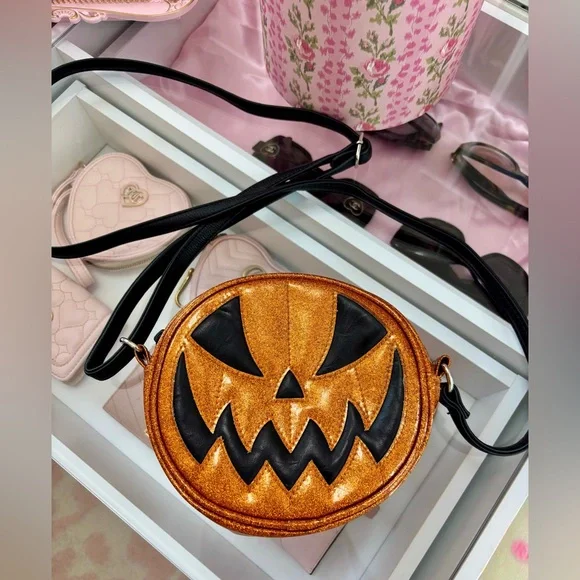 Original Lovepainandstiches pumpkin crossbody purse. Sold out online. Excellent condition. This stylish crossbody bag features a fun pumpkin face design, perfect for a Halloween lover. Gorgeous orange glitter design make it a standout accessory for a spooky lover. Long adjustable strap Silver hardware Clean interior no scuffs Mini bag Measurements approximately: 7” wide by 6.5” tall by 2.5” deep. Smoke free home Bundle more items to save! 💖Tags: Handmade | Halloween | Pumpkin Purse | Crossbody bags | Jack o lantern bag | Pumpkin Kult | Bags | Pumpkin Spice | Hay Rides | Unique | Skulls | Fall Vibes