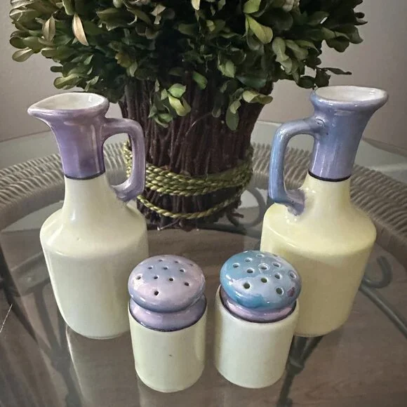 Vintage Lusterware Vingar&Oil Creuet Salt&Pepper Set Periwinkle Flora Butterfly Motif Japan So lovely Hand Painted with the prettiest Porcelain luster of Periwinkle!In Good condition with no chips or cracks.Time Line (1920's-1940's)Approx: Vinegar Creuet 5"T x 2 1/2" W weighing 4.5 ounceOil Creuet 5"T x 2 1/2" W weighing 4.5 ounce.Salt & Pepper 2 1/2" T x 1 1/2" W weighing 1.7 ounce eachA Bit of History:Japanese lusterware was primarily produced between the mid-1920s and the 1940s. Specifically, from 1921 to 1941, pieces intended for the US export market were marked "Japan" or "Made in Japan". Earlier pieces, from 1891 to 1921, were marked with "Nippon". After World War II, from 1947 to 1952, some pieces were marked "Made in Occupied Japan"I do have other lovely lusterware items listed if interested.Thank You For Visiting :) *I ship out same day* **All questions encouraged & additional photographs will be sent upon request Please Look at all photo's as all sales are final**