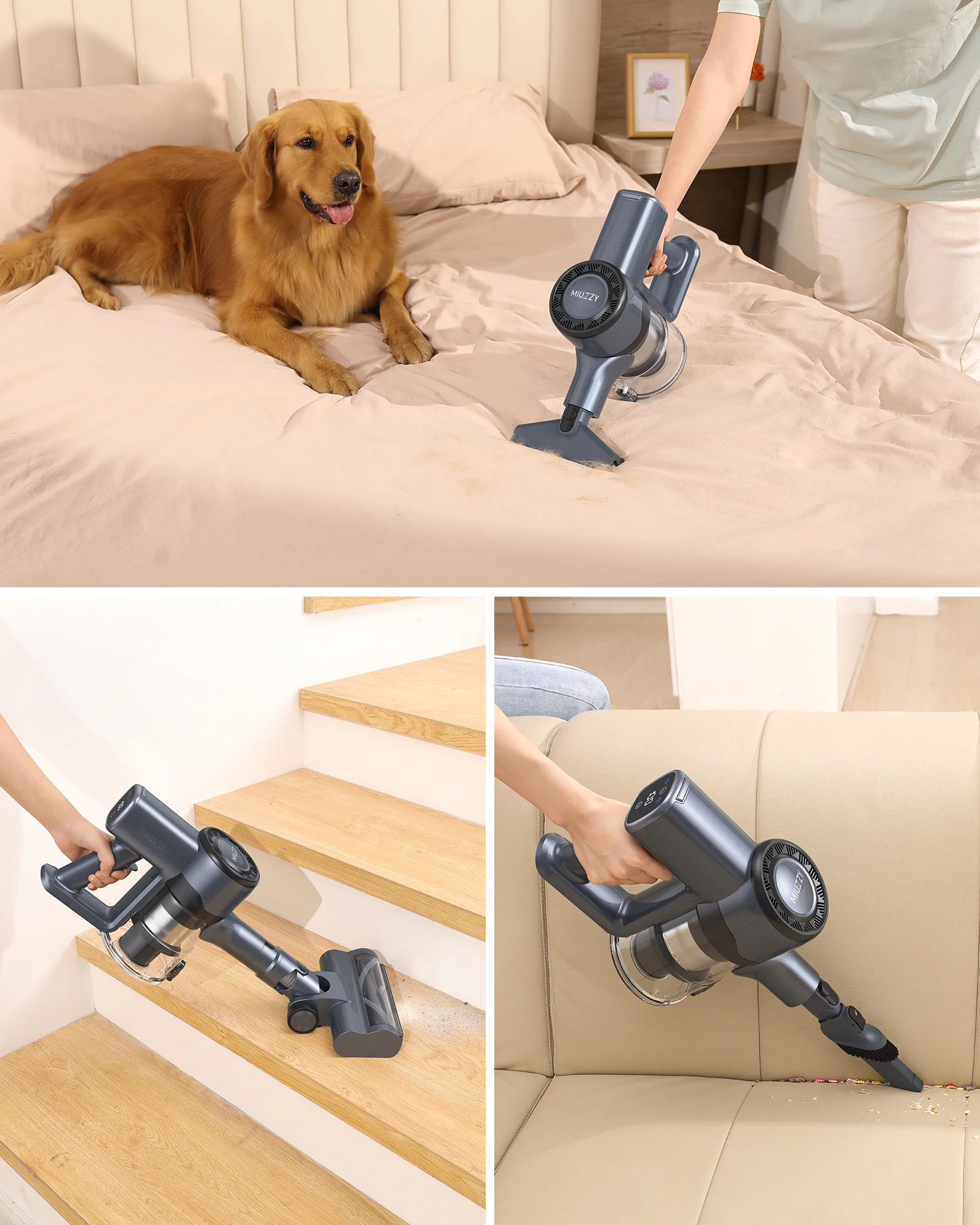 Strong suction power for deep cleaning: with a powerful 260 W brushless motor, MIUZZY wireless vacuum cleaner offers a suction power of 30,000 Pa in MAX mode. This makes vacuuming dirt, dust, crumbs, pet hair and more a breeze. Provides you with an efficient and quiet cleaning experience for a clean home environment.