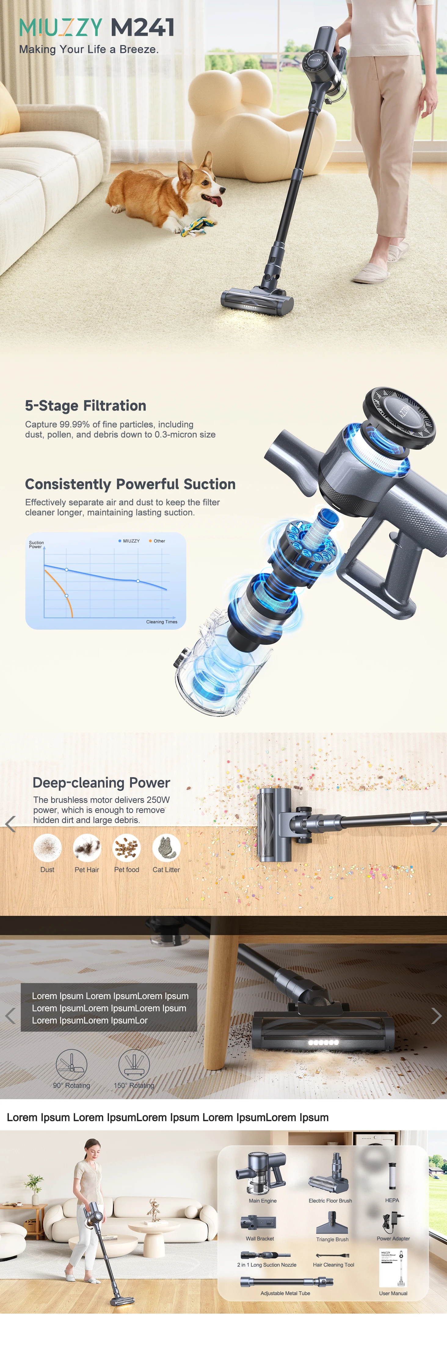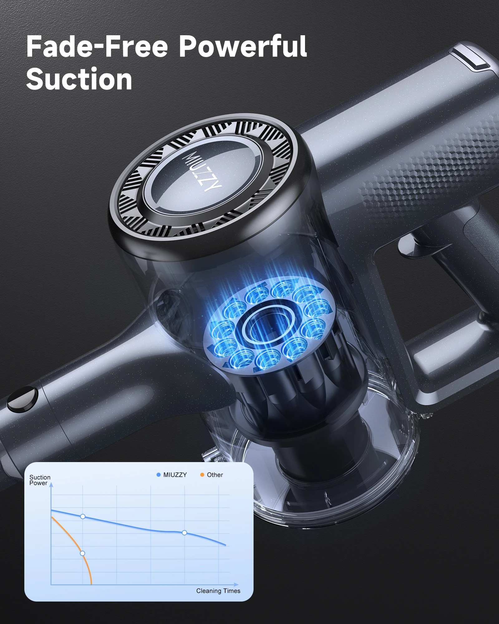 Long-lasting suction power without decreasing: MIUZZY M241 cordless vacuum cleaner has an optimised and improved cyclone filter structure, can effectively catch dirt and dust, and continuously generate a strong air flow, significantly reducing the problem of suction damping.