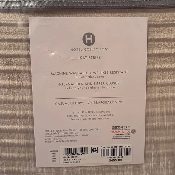 Step into serenity with Ikat Stripe bedding collection. The design is a subtle stripe with a sophisticated ikat effect, reminiscent of scenic sand dunes. The jacquard construction is a textural ottoman weave that adds dimension to fabric. The tones of ivory and sand add warmth to any bedroom.KingNew in package, never opened Retail $405