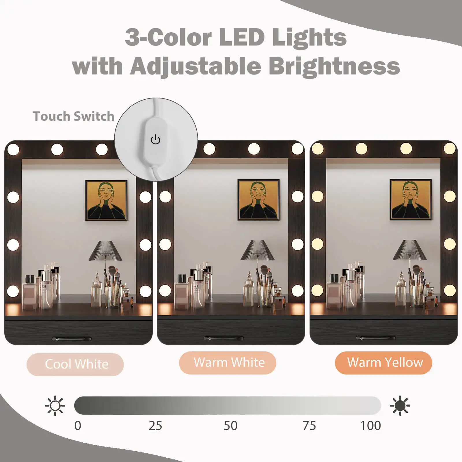 This makeup table features a built-in charging station with 1 USB ports, 1 Type-C port and 2 AC outlets for convenient device charging. The HD LED lighted mirror offers adjustable brightness and 3 color options to suit your needs. You can stay organized with ample storage including drawers and open shelves. This stylish and practical dressing table makes a perfect gift for loved ones on special occasions, combining functionality and elegance beautifully.