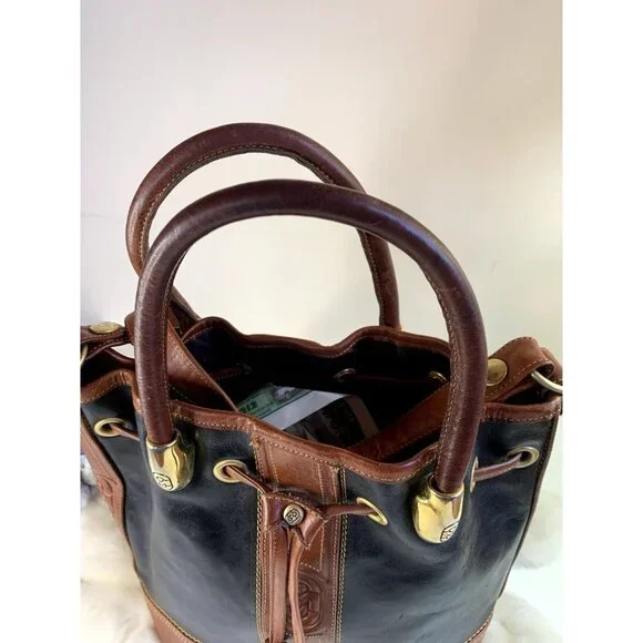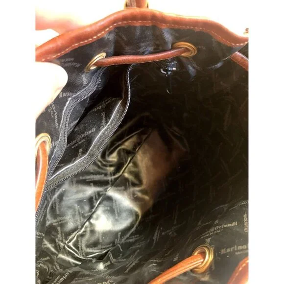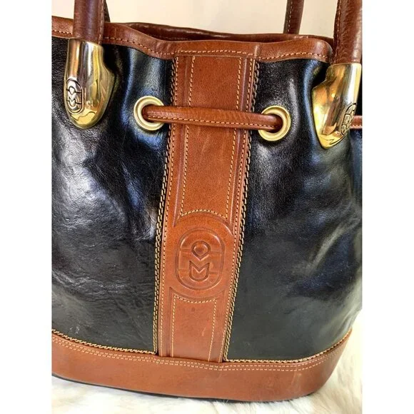 Marino Orlandi Vintage Italian Leather Bucket Bag Satchel in Black and Tan. This stunning, medium-sized bag is made of genuine, top grain leather that smells wonderful! Black leather body with tan leather contrasting structured straps and drawstring top. "M" logo heat stamp on straps and interior. Brass hardware and five feet. Interior lined in black leather stamped with Marino Orlandi signature and heat stamp leather plate. Interior zipper pocket.Features:• Vintage Leather Bucket Bag• Made in ItalySize: Womens MediumMeasurements:Length 10 in / 25 cmWidth 5 in / 13 cmHeight 10 in / 25 cmStrap Drop 21 in / 53 cmCondition: Pre-Owned Like NewPristine. Thank you for viewing this listing. See our profile for other great items. Bundle and save on shipping.