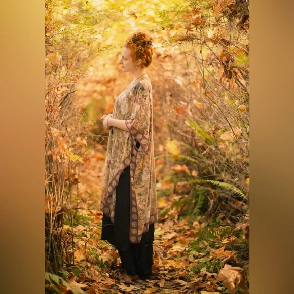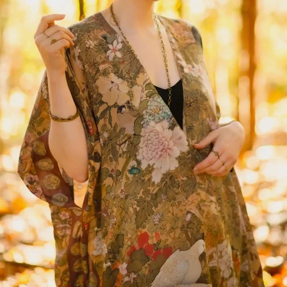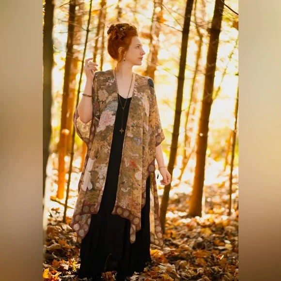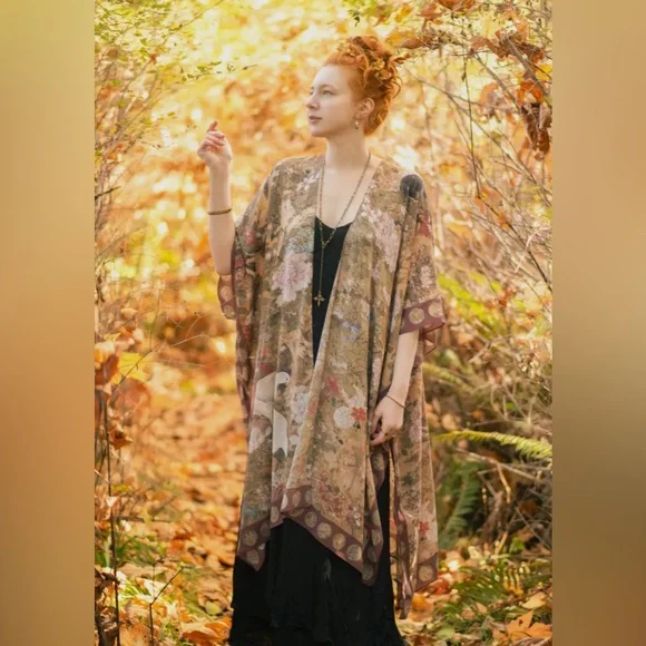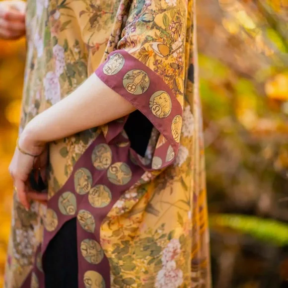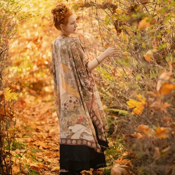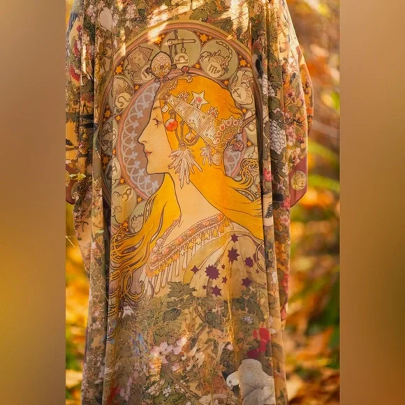 A regal, resplendent celebration of the stories told in the stars! Our Dreamweaver design features an iconic 1896 zodiac illustration by beloved Art Nouveau artist Alphonse Mucha, depicting a woman majestically surrounded by the by the 12 zodiac signs and adorned with intricate celestial jewellery. The background of this beautiful piece comes from a floral ink-on-silk scroll painting by Ueno Setsugaku, created in the 1860’s. To add even more detail to this design, we embellished the woman’s remarkable crown with a shining star, and trimmed everything with Mucha’s zodiac signs on a deep burgundy background. The result is an opulent and elegant take on Mucha’s work, with a nod to the luxe bohemianism of the 1970’s.100% bamboo/wood viscose. Machine wash gentle or handwash and hang to dryIron to finish if needed.Kimono meaurements: length 92cm, width 110cm. Model is 5'9" for reference. “A dreamer is one who can only find her way by moonlight.” - Oscar Wilde