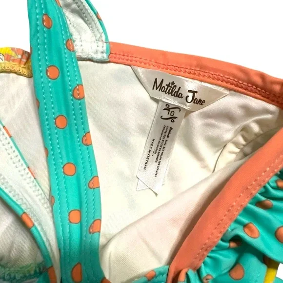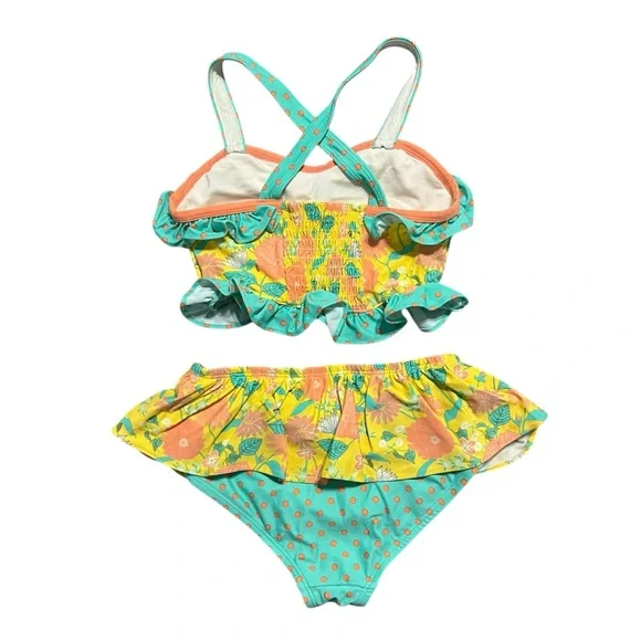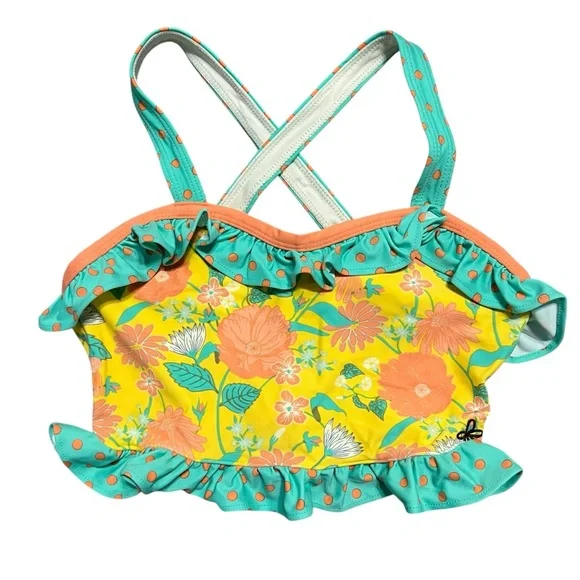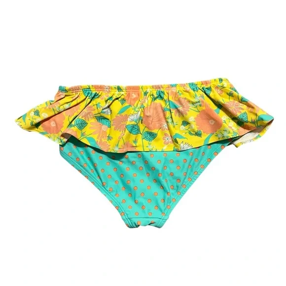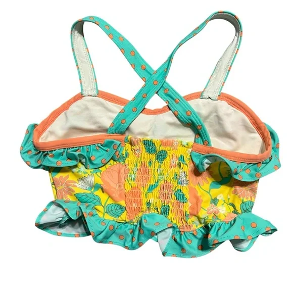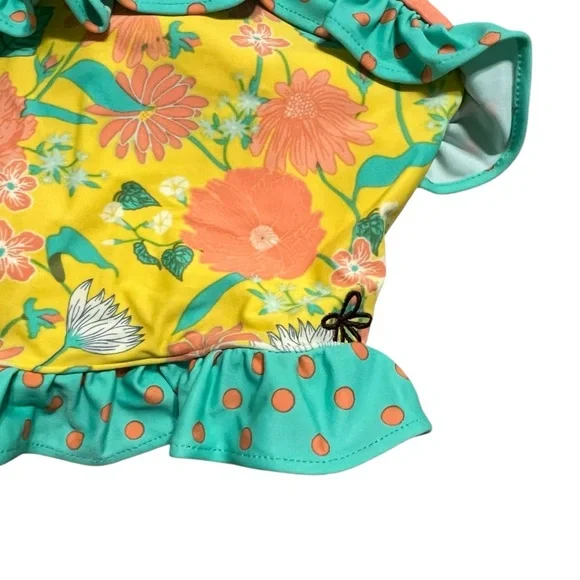 This pretty bathing suit set features a two piece style in multicolor tones. It has a mixed print design with floral print and polkadots. The top has cute ruffle detail, and straps that crisscross along the back. The bottoms have a skirted ruffle look with yellow floral ruffles over Polkadot print material. VGUC Size 10(LD123)