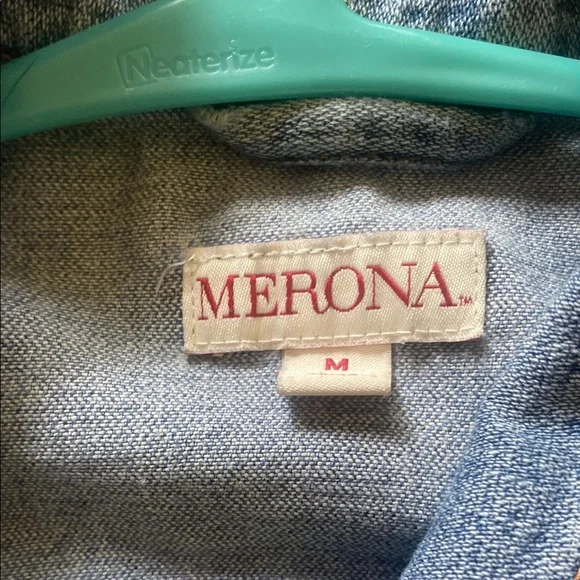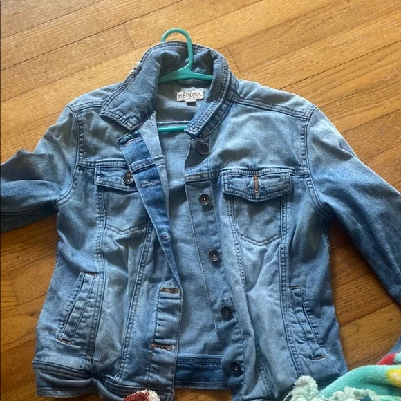 This Merona jean jacket combines classic denim with vibrant blue and green accents, offering a unique and stylish look. The jacket features hand painted backing that adds a personalized touch to its rugged design. Perfect for those seeking a blend of traditional and contemporary fashion in their outerwear.