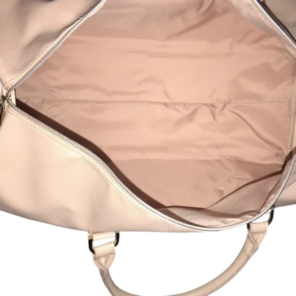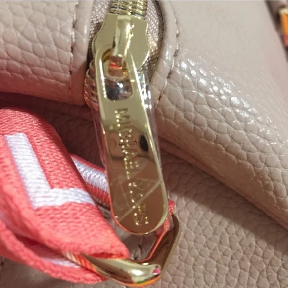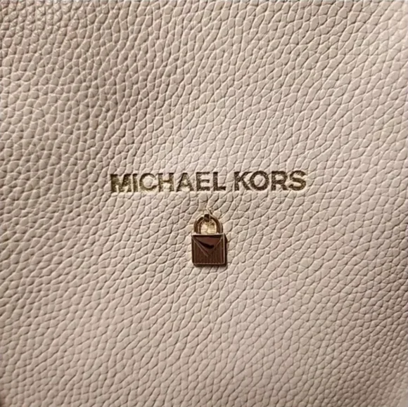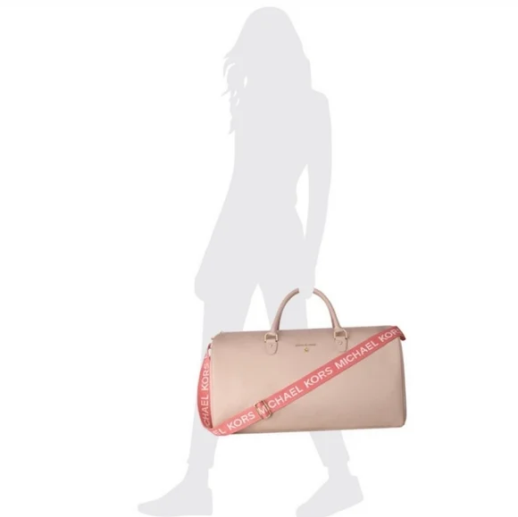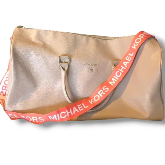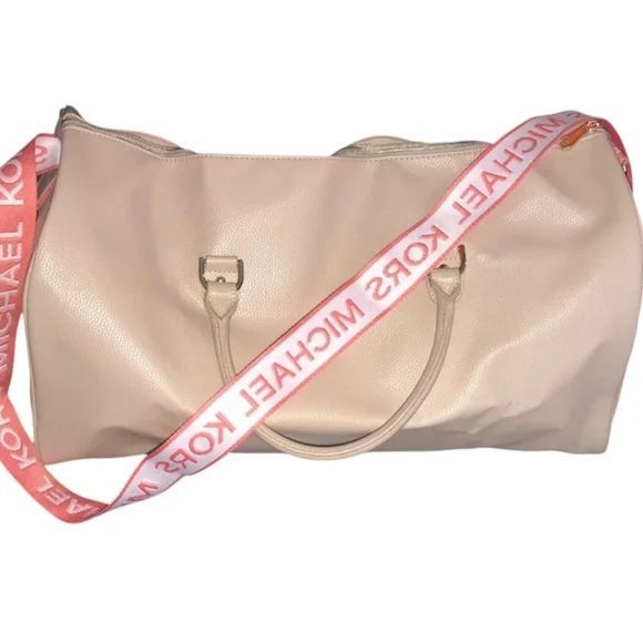 Large Michael Kors Faux Pebbled Leather with Fabric Embroidered Shoulder Straps. It Measures approximately 17" x 13" x 7"Pre-owned has a few marks color Blush This Michael Kors Beauty Blush Faux Pebbled Leather Weekender Duffle Bag is a stylish accessory for any occasion. With a large size and adjustable shoulder strap, it is perfect for travel, business, or casual use.The exterior is made of durable canvas material with a blush pink color and pebbled finish, adorned with a Michael Kors logo and gold hardware. The bag features a zip closure and a pink handle/strap color that adds a pop of color to the overall design. The interior is spacious and features a zippered pocket for added organization. This designer duffle bag is a must-have for any fashion-forward woman and is part of the Michael Kors product line.Inventory #CN