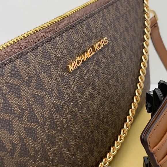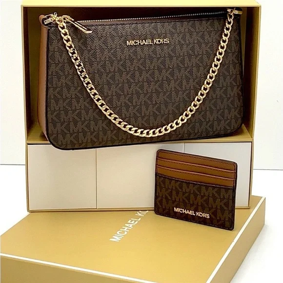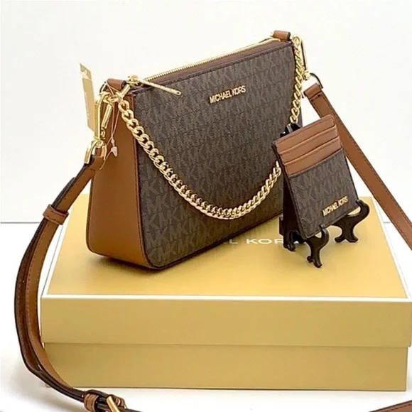 Please look at Approximate dimension below before purchasing. 9.5"W X 5.5"H X 2.5"DAdjustable strap: 20.5"-24.5"100% AuthenticComes with Box.New Style - Michael Kors Giftable Boxed Items Xbody + Card Holder Comes with boxBROWN SIGNATURE COLOR Coated Canvas--PVC MaterialGold tone hardwareInterior details: back slip pocket, 3 front card slotsLining: 100% polyesterZip fasteningImported9.5"W X 5.5"H X 2.5"DAdjustable strap: 20.5"-24.5