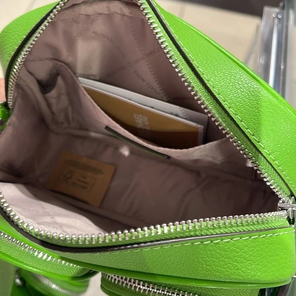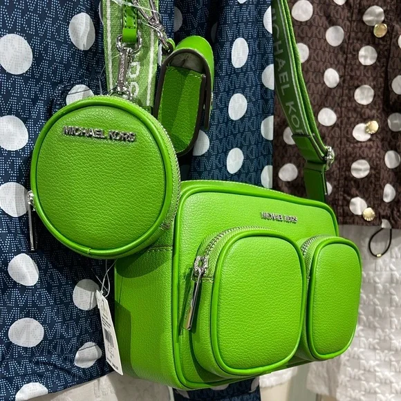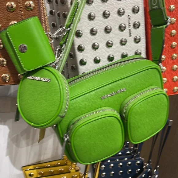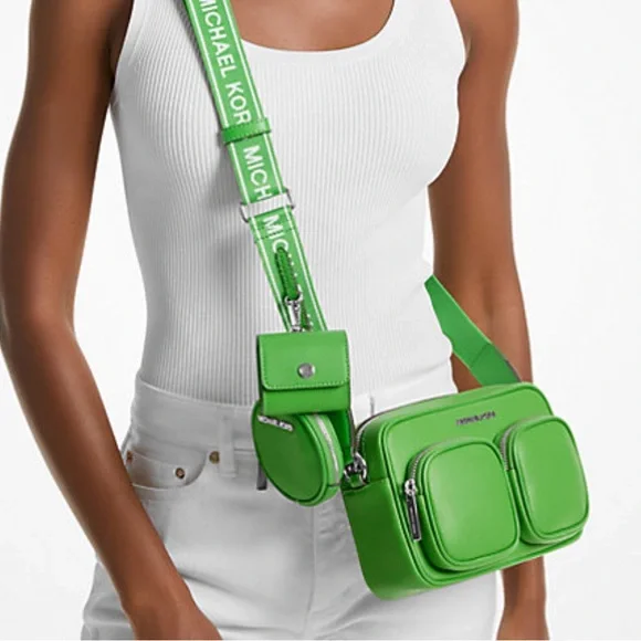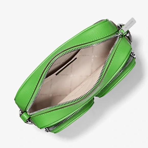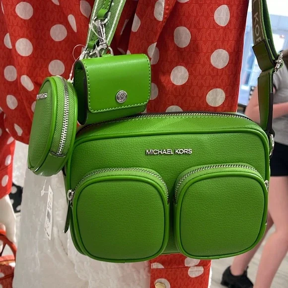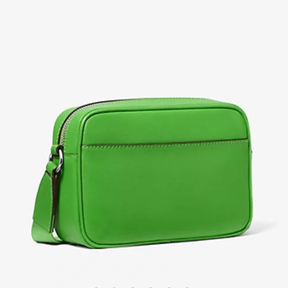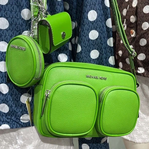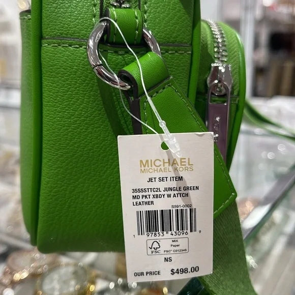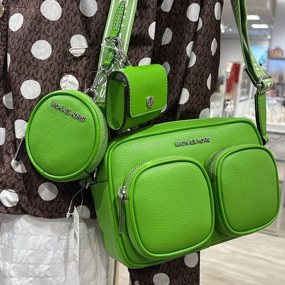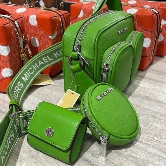 Stylish green leather crossbody bag perfect for everyday use. Features a sleek design with a comfortable strap.Michael Kors Jet Set Leather Medium Crossbody Bag with Case for Apple Airpods Pro®Jungle Green NWTAuthentic Michael Kors—defining modern glamour since 1981.• Crossbody bag• Leather• 100% leather• Silver-tone hardware• 8”W X 5”H X 2.75”D• Adjustable strap: 15.25”-23.5”• Exterior details: 2 detachable pouches, back slip pocket, 2 front zip pockets• Interior details: back slip pocket• Coin pouch: 3.75"W X 0.75"D• Apple AirPods® pouch: 2.75"W X 2.5" H X 1.25"D• Compatible with AirPods Pro for Apple®. AirPods® and AirPods Pro® are a trademark of Apple, Inc.• Lining: 100% polyester• Zip fastening• Dust bag not included• Imported• Style # 35S5STTC2L
