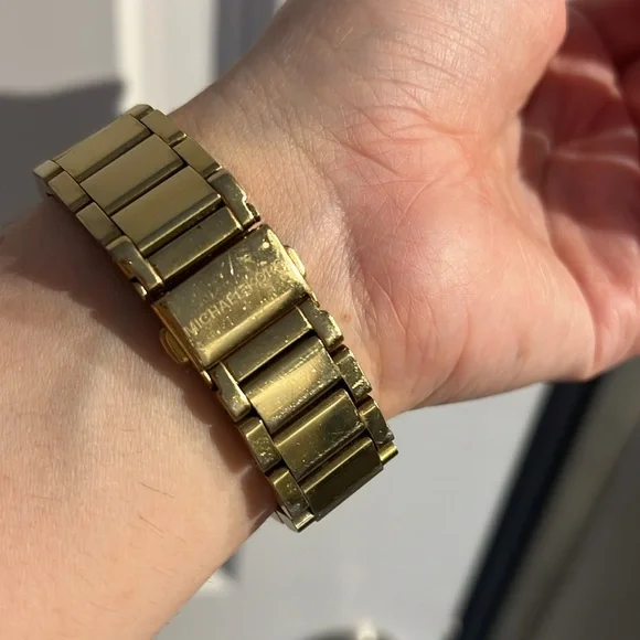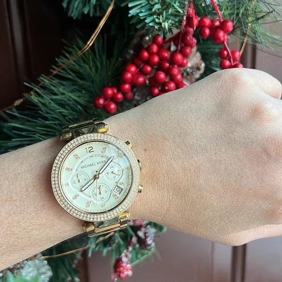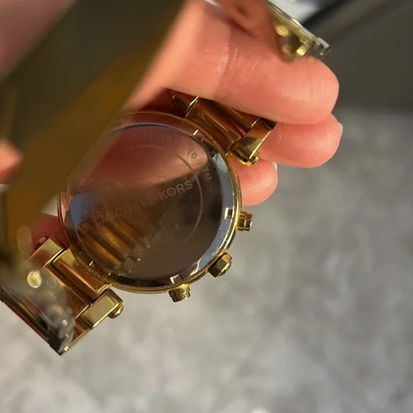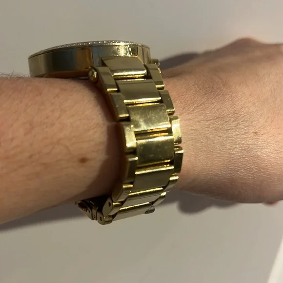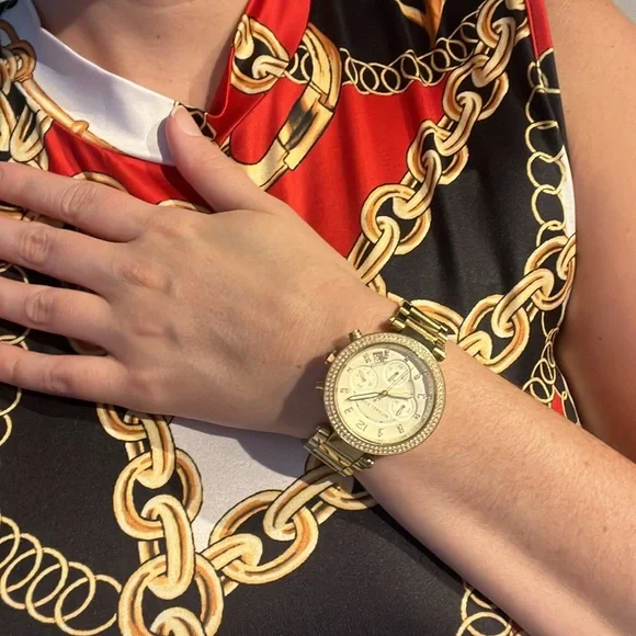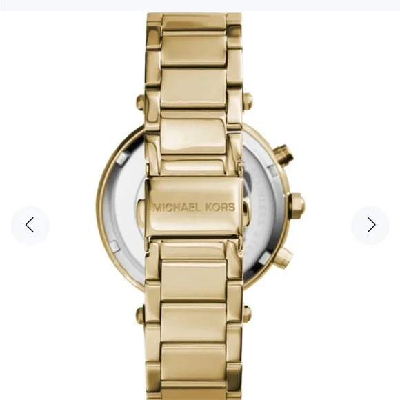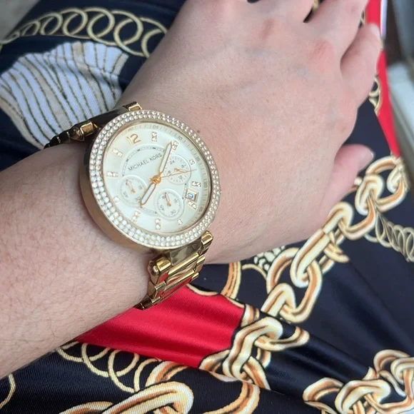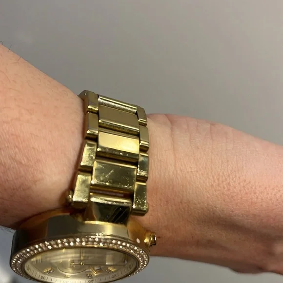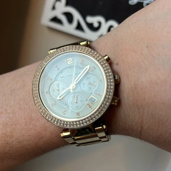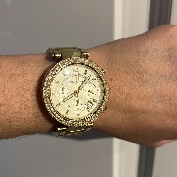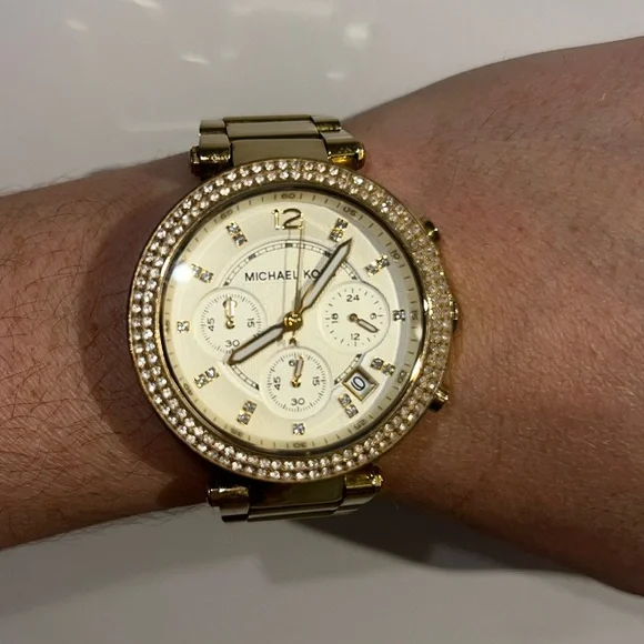 Fits a 6” wrist as is. Just bought a new battery for it on 1/8/25. General signs of use with mild scratches a little bit all over. Style number MK – 5354.The Michael Kors MK5354 Parker Chronograph watch is a luxurious and functional ladies' watch designed for the modern woman. Featuring a glamorous gold finish and multiple chronograph sub-dials, this timepiece adds a touch of sophistication to any ensemble.Band material: Stainless SteelBand color: Gold ToneBand width: 18 mmCase size: 39 mmCase color: Gold-toneDial color: Beige (Chronograph, Date, Hour, Minute, Second)Water resistance: 50 meters / 165 feetMovement: QuartzWhy Choose the MK5354 Parker?This Michael Kors MK5354 chronograph watch seamlessly blends luxury with functionality, making it an ideal accessory for both casual outings and formal events where you want to make a statement.