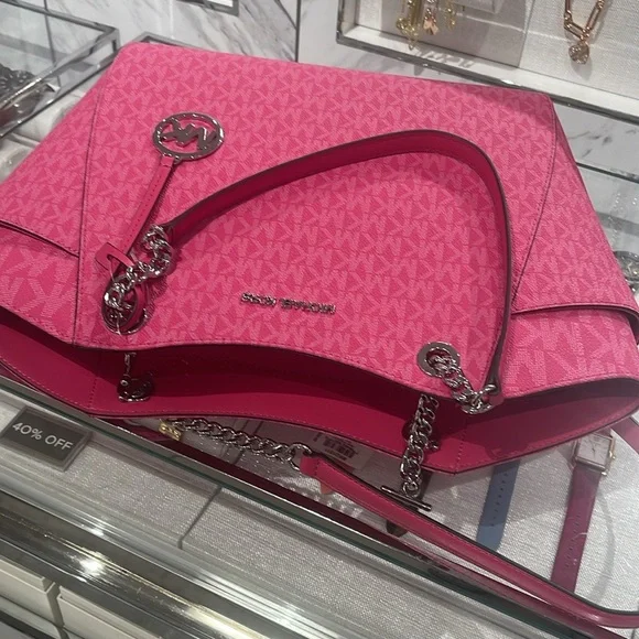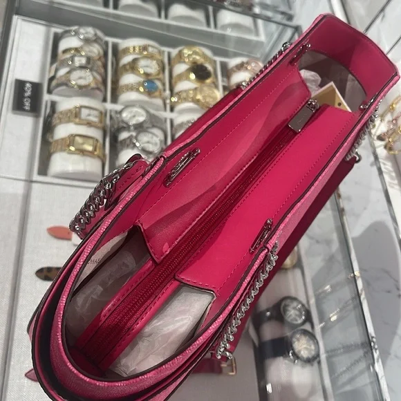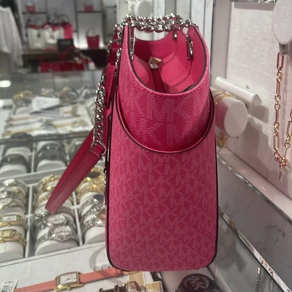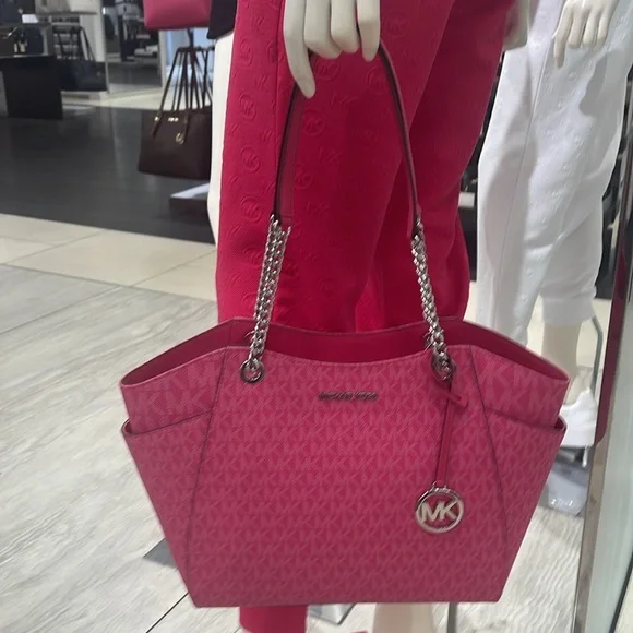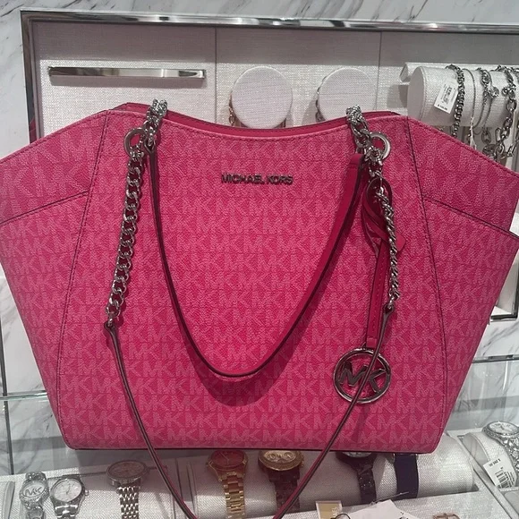 Michael Kors Pink Jet Set Travel Large Signature Logo Chain Shoulder Tote BagDragonfruitNWT Authentic Ready to take you anywhere, this Jet Set shoulder bag is rendered in signature and finished with our signature charm. The architectural shape features convenient side pockets and a secure top-zip fastening. Use it to carry all your travel essentials.• Shoulder bag• 100% leather from tanneries meeting the highest standards of environmental performance• Silver -tone hardware• 15.5"W X 9.75"H X 5.5"D• Handle drop: 10"• Exterior details: 2 side snap pockets• Interior details: back zip pocket, 2 front slip pockets• Lining: 100% polyester• Zip fastening• Dust bag not included• ImportedMICHAEL KORSJET SET TRAVELLG CHAIN SHLDR TOTE