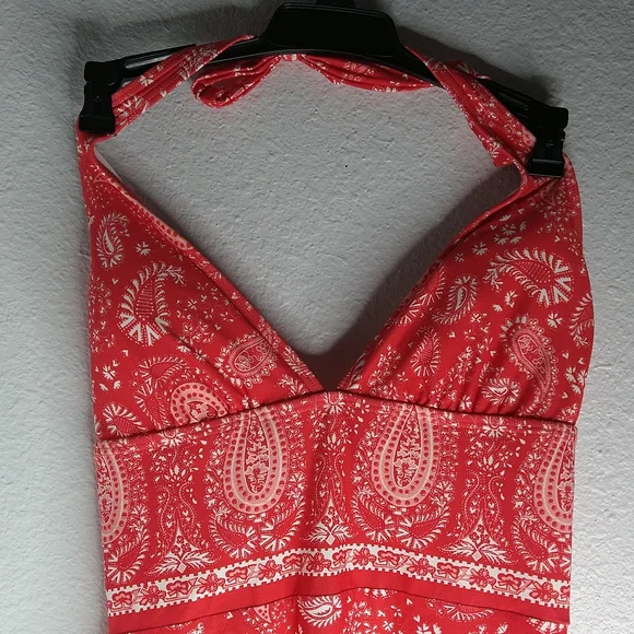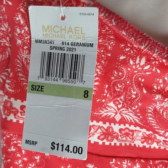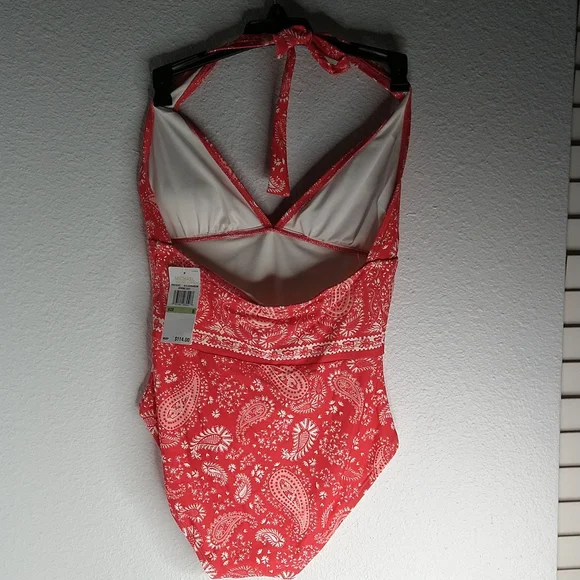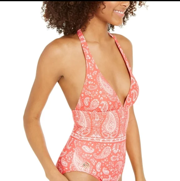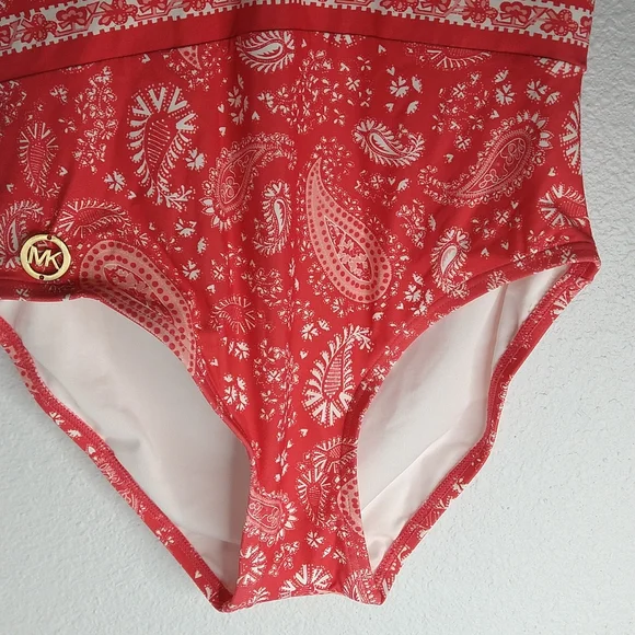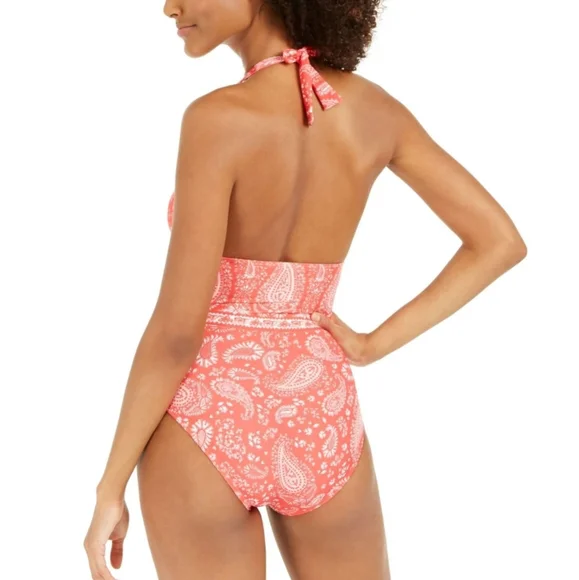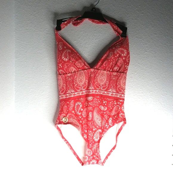 Michael Kors Romantic Parsley Halter One-PieceAll-day beach play begins and ends with this bold printed one-piece by Michael Michael Kors, a playful style with a plunging neckline.Nylon/spandexLinedRemovable soft cupsPull-on styling; halter straps tie at neckModerate bottom coverageDeep V-neckHand wash