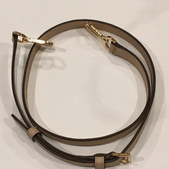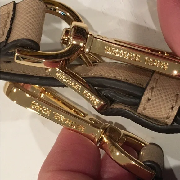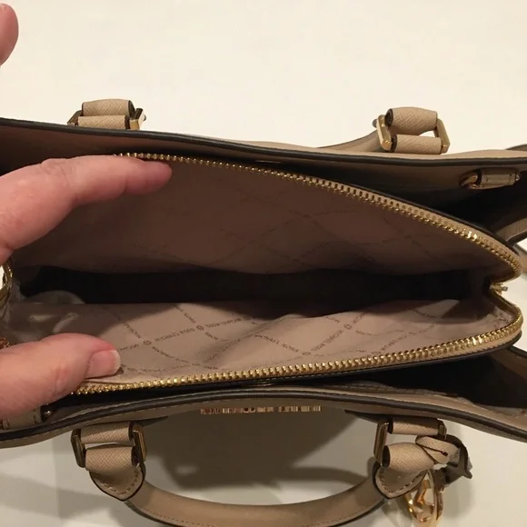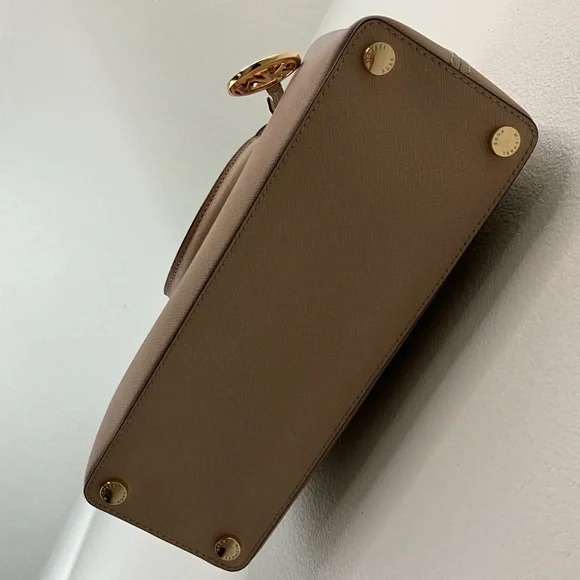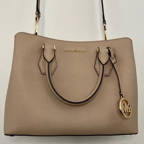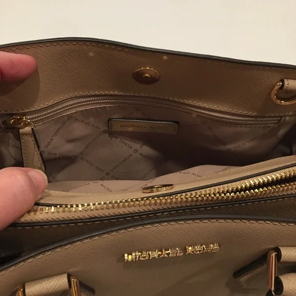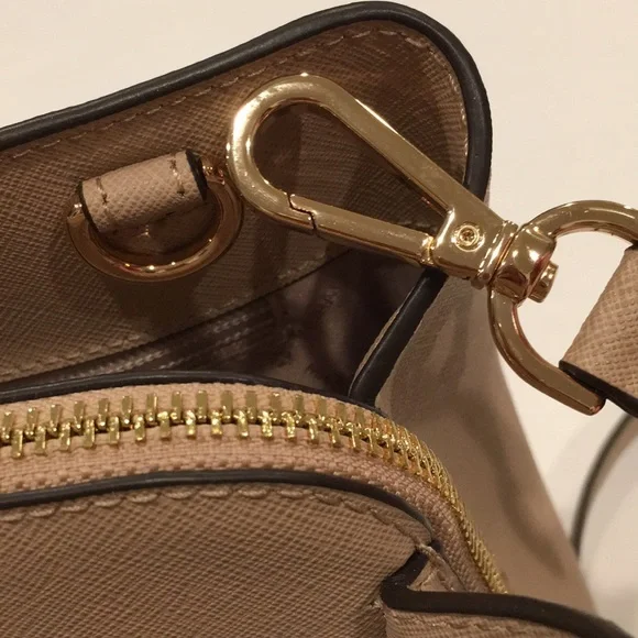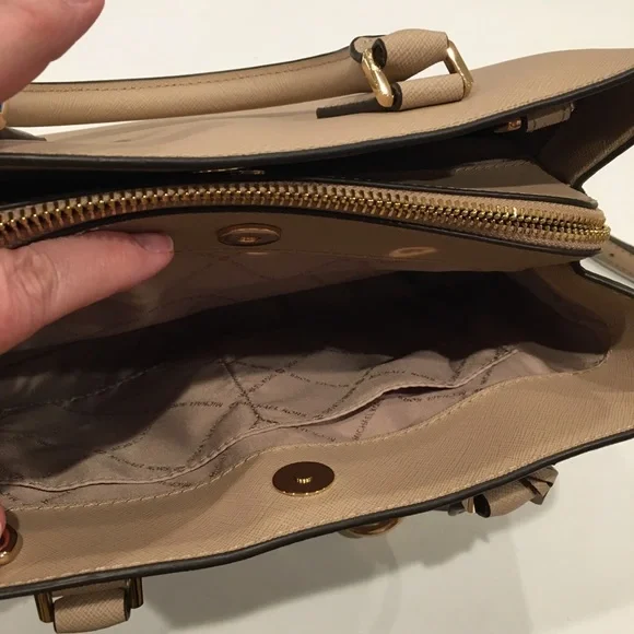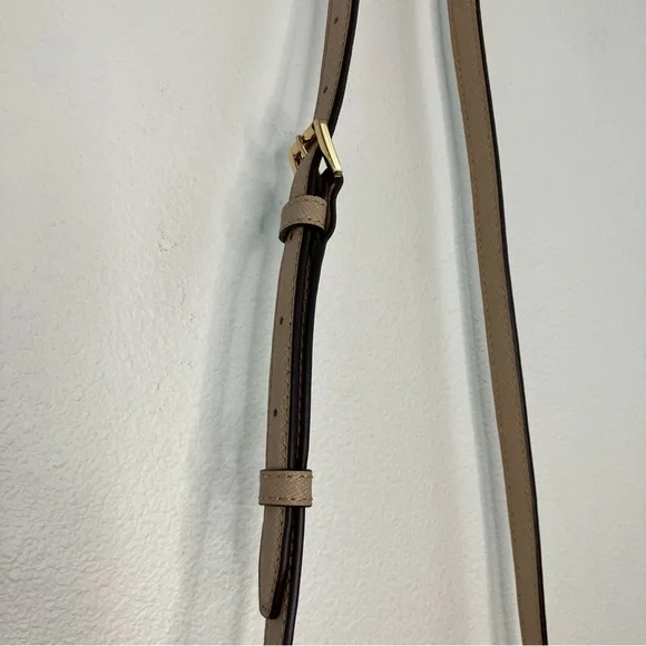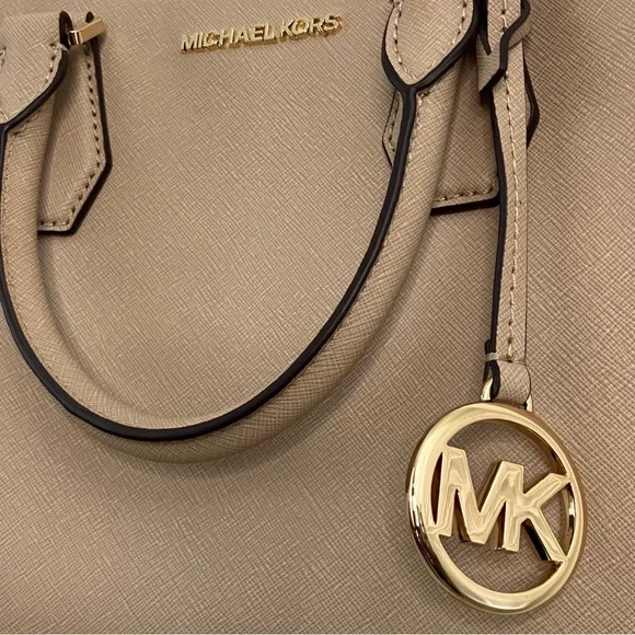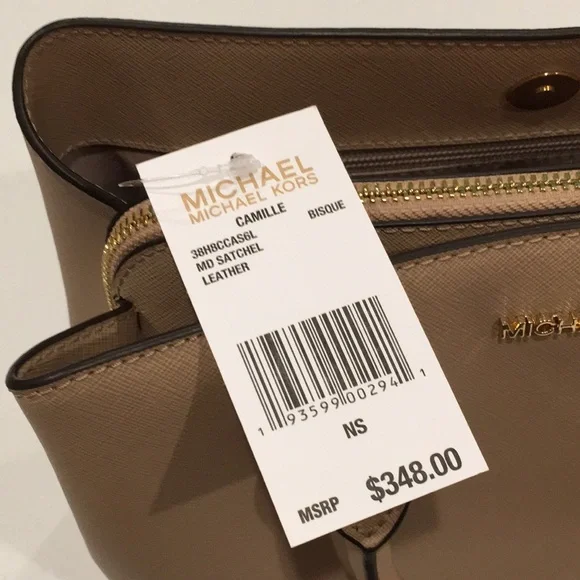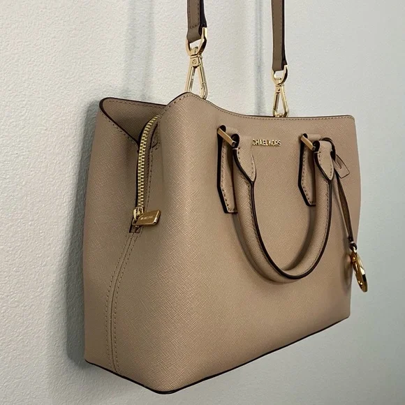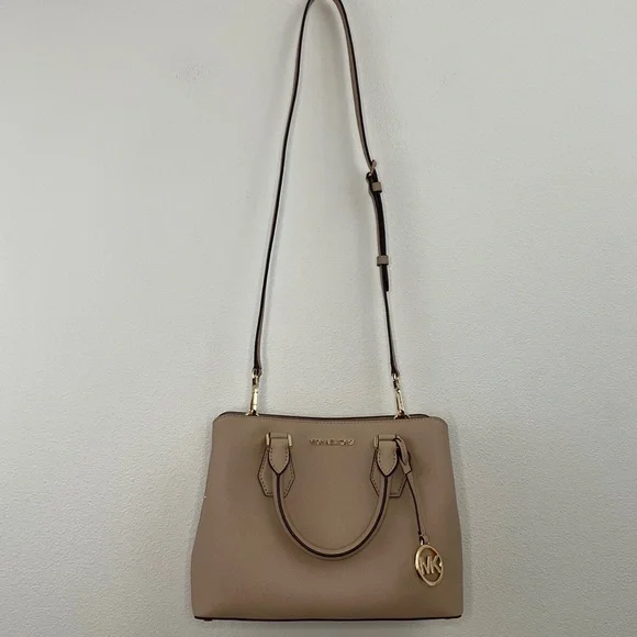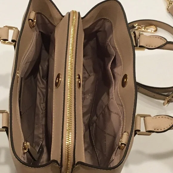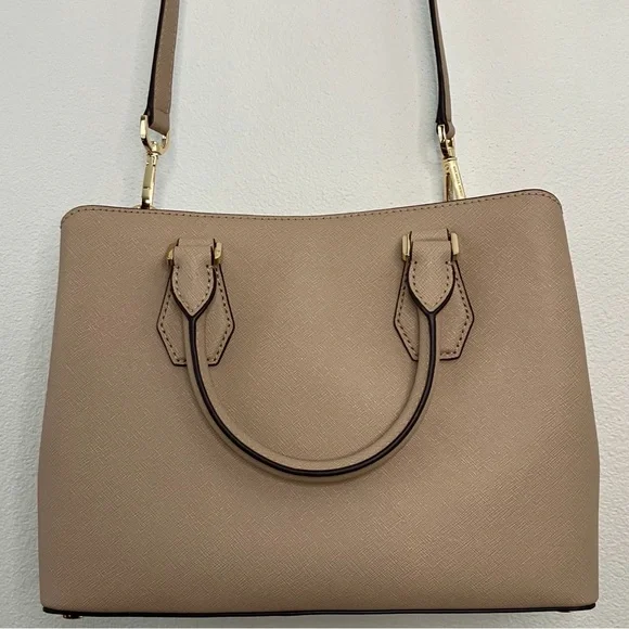 Elevate your style with this elegant Michael Kors, Camille shoulder, crossbody & handbag. Has an adjustable and detachable crossbody shoulder strap. Color is “Bisque” cream with black edges. All hardware is gold. Three sections inside bag. Center has a zipper closure. Both sides have a magnetic snap closure. Inside bag has one zipper pocket & two open pockets. Crafted in a versatile tan leather, it's perfect for any occasion. The sleek design and premium quality make it a must-have accessory. Measures approximately 10” wide 8.5” tall with 4” drop double handle & crossbody has max 22” drop. In excellent new condition. NWT