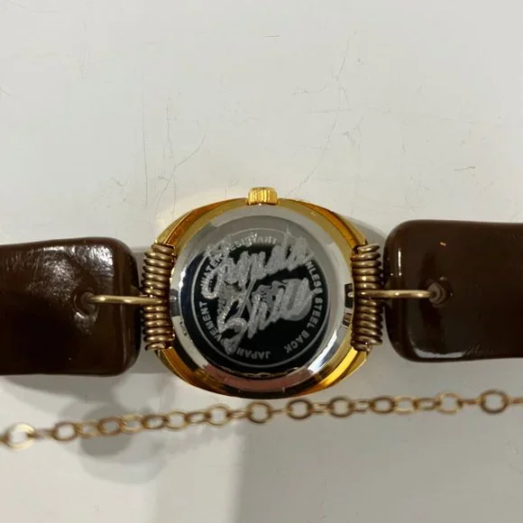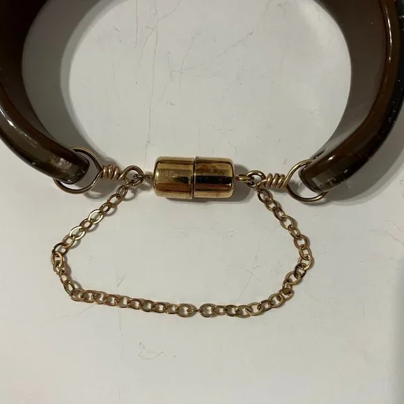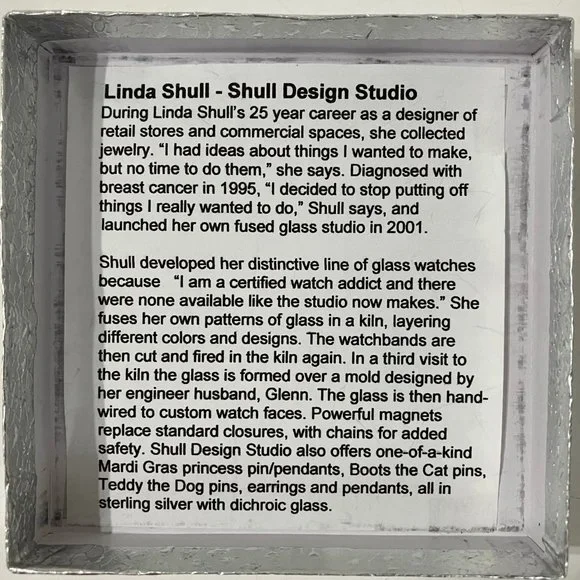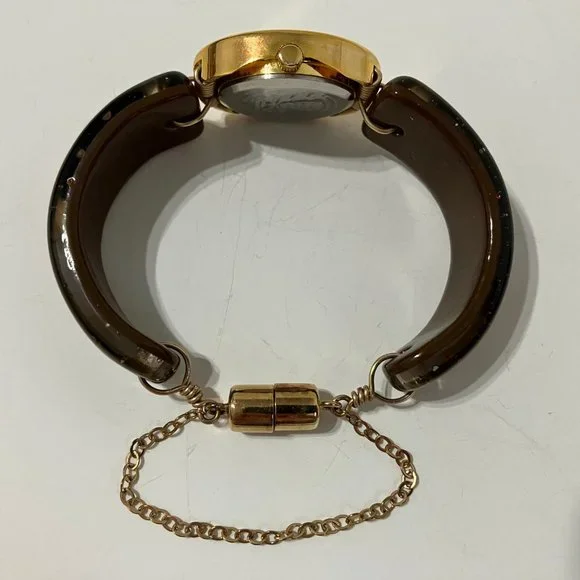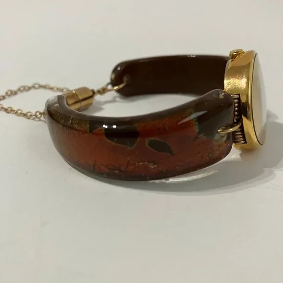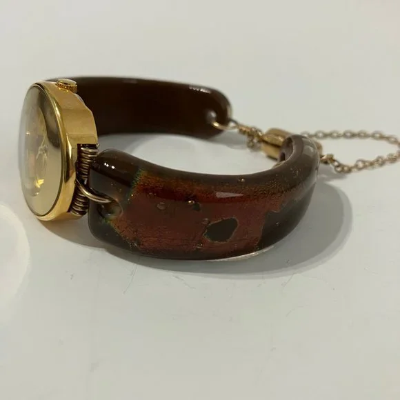 Mocha glass handcrafted wristwatch.Oval face in gold metal.Shades of brown fused dichroic glass band that changes color in the light.A must have for any wardrobe.Magnetic closure for easy on and off, and a safety chain provides added security.Medium size (6 ½"), face approx. 1” wide.New in box. A new battery will be installed at time of sale.104 800 051