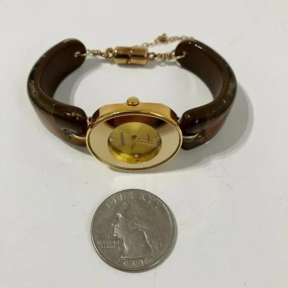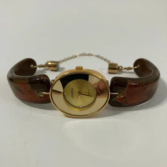 Mocha Brown Watch Fused Dichroic Glass Band Oval Gold Metal Ladies Wristwatch