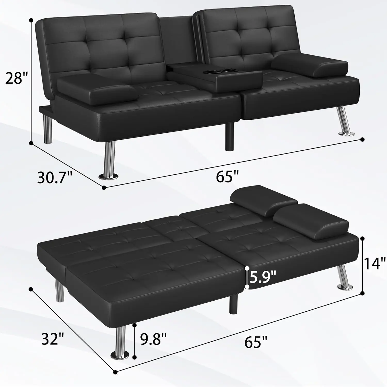 Futon Sofa Bed Modern Folding Futon Set Convertible Recliner Lounge for Living Room with 2 Cup Holders, (PU Leather, Black)