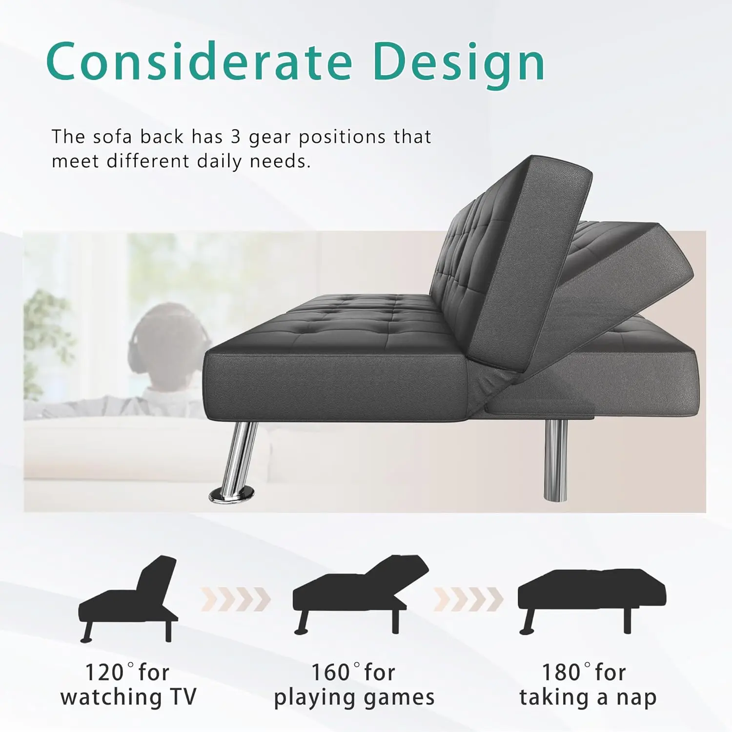Adjustable Back: The futon sofa bed has 3 positions adjustable, among 120°, 160° and 180°, which allows you to enjoy cozy vibe at home, no matter watch TV, play video games or take a nap