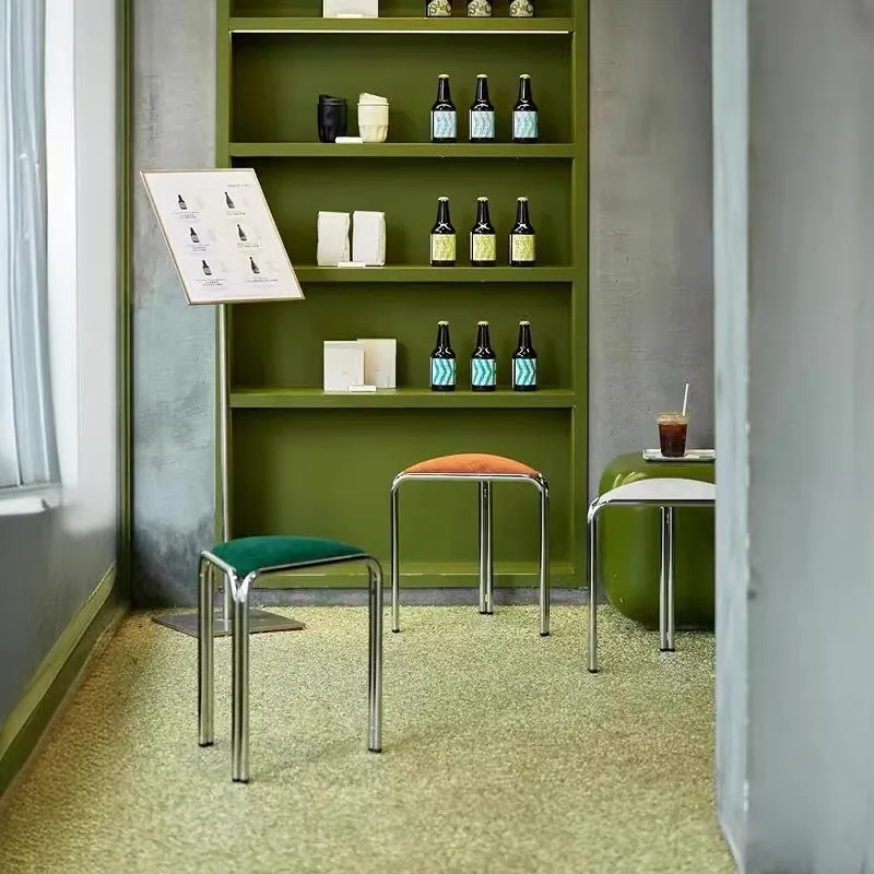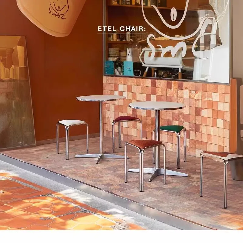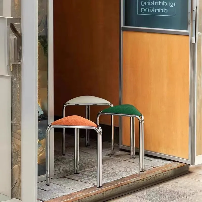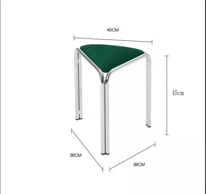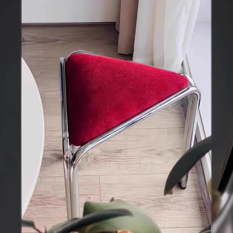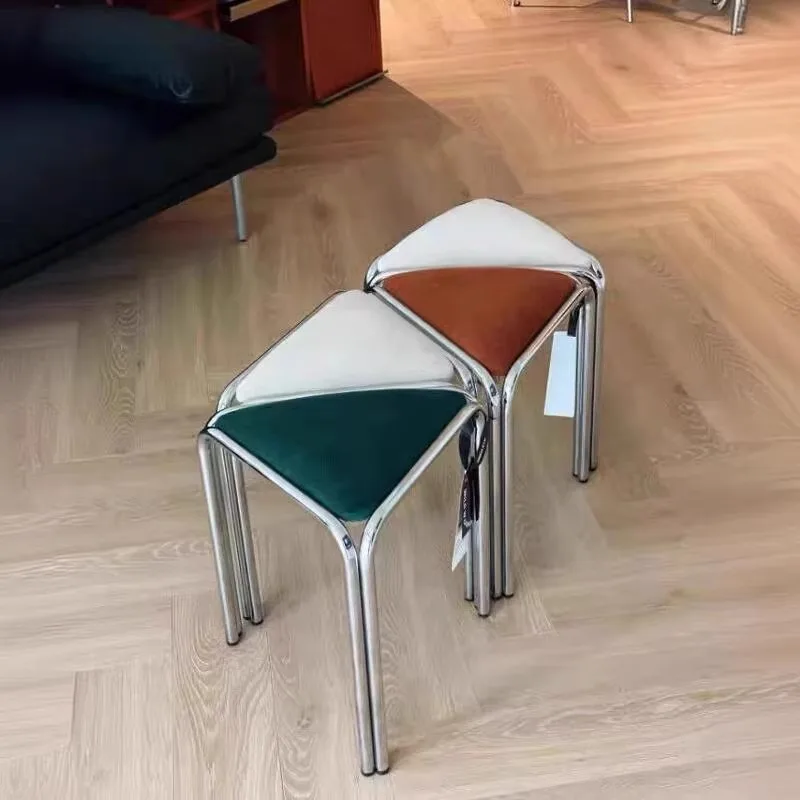 MOMO Bauhaus Antique Vanity Stool - Stainless Steel Triangular Frame Fabric Upholstered Stackable Designer Dining Stool