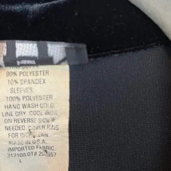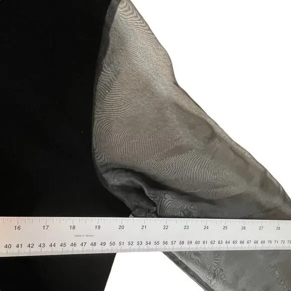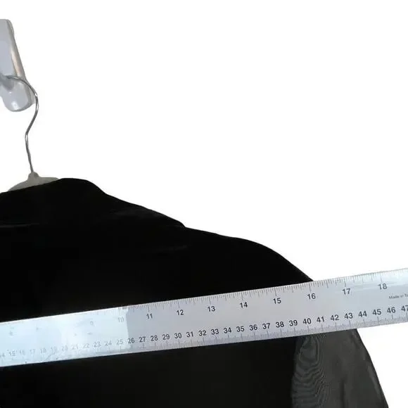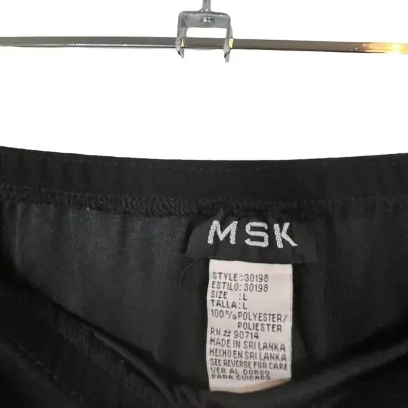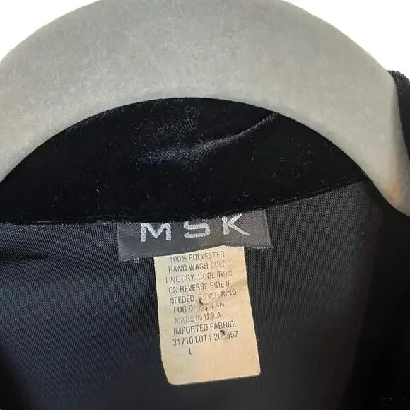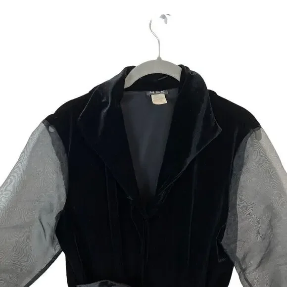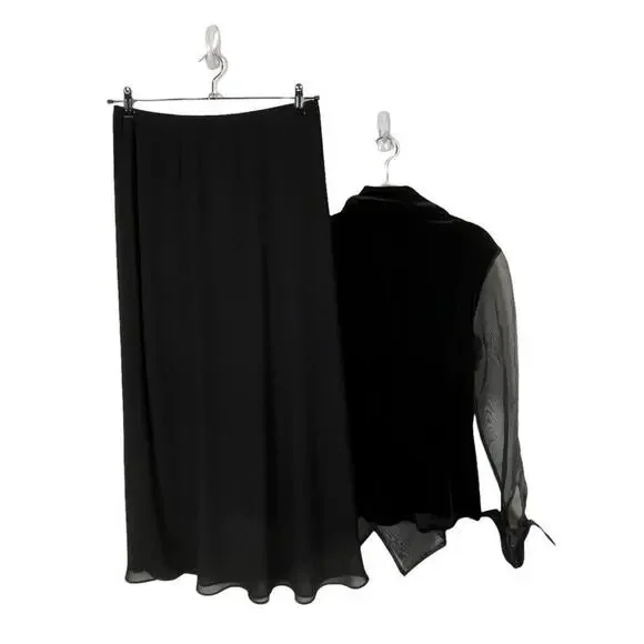 MSK 90s Vintage Skirt Set Witchy Black Velour Chiffon Unmatched Set-Jacket USA LThis is such a great set. I swear I had this skirt and went dancing in it with my corset top in the 90s. Gotta love those memories at The Vogue in Seattle. (Or the Catwalk, but I liked Vogue better)The chiffons do not match. The skirt is more of a dusty black and the sleeves and tie on the top are more crisp shimmer black. They do go together fairly well, but you can break them up and have lots of ways to wear these two pieces. If the difference will bug you, don't order this set.Thank you for looking!Much love,AmyBox AE