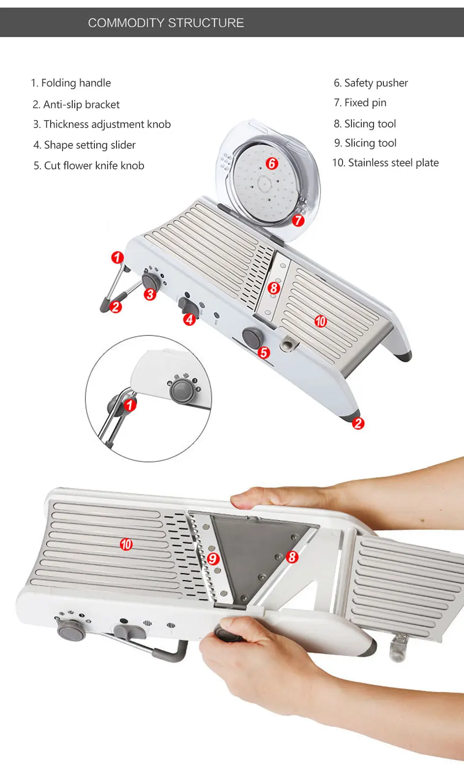 The multi-functional slicer can be adjusted to 18 types of slices and silks of different sizes.