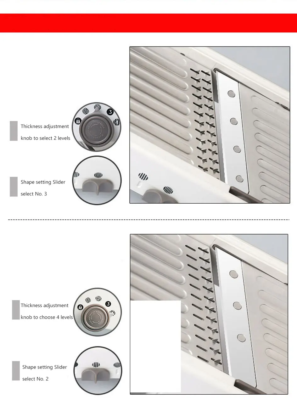 【Adjustable Slicer】: Slice from paper thin to 9mm thick. Two julienne settings,4.5mm and 9mm. Just adjust the knob to find your perfect cut.