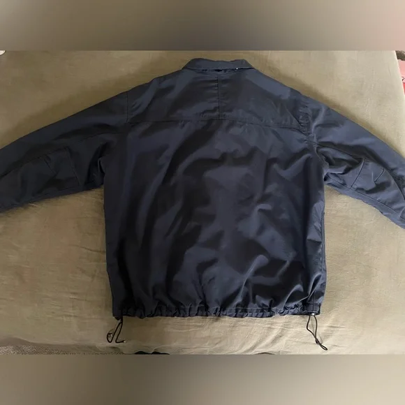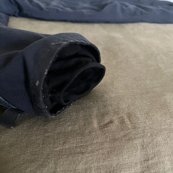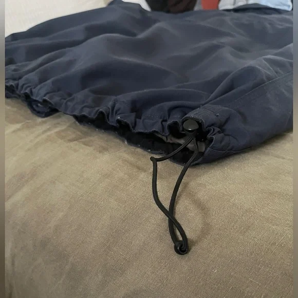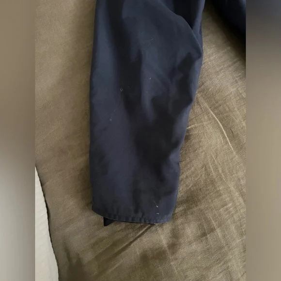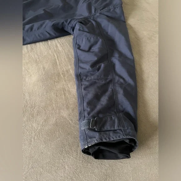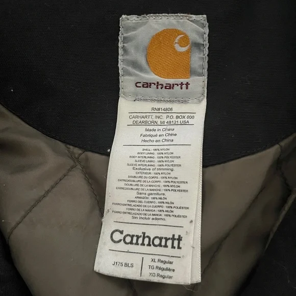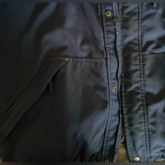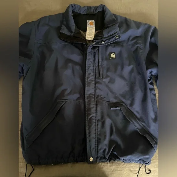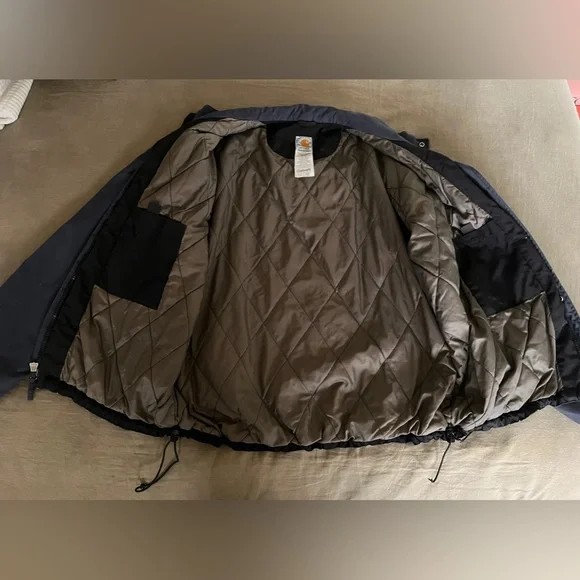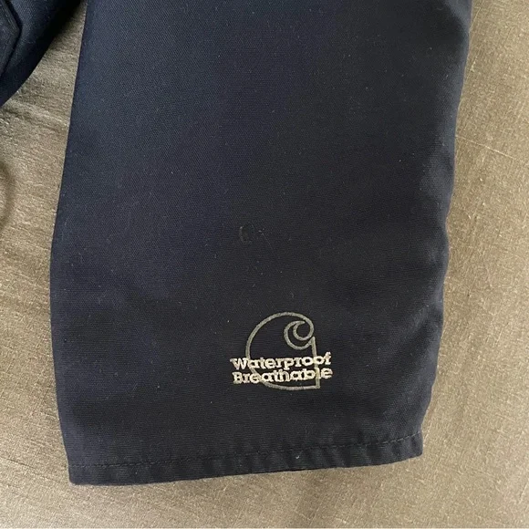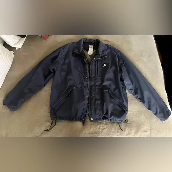 Navy Blue Waterproof Carhartt Jacket - Size XL• Soft taupe/chocolate brown lining • Waterproof• Zip + button closure• Cinching adjustable elastic hem• Two inner pockets with Velcro closure • Two outer side pockets and one chest pocket (zip closure) • Contouring seams on sleeves for added movementThis is a very warm, heavyweight, quality jacket. Deep Navy shell and beautifully quilted inside. It was used as a work jacket so there are some signs of use. Please see pictures for examples. The integrity and functionality of the jacket remain in excellent condition. Retails ~$150 new.