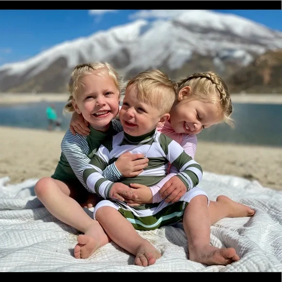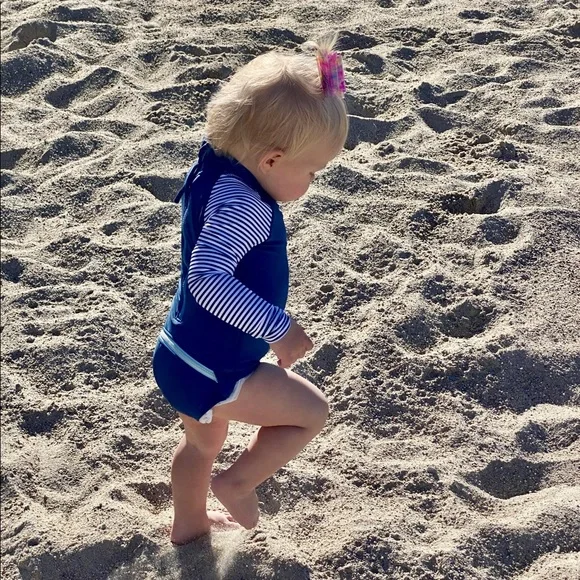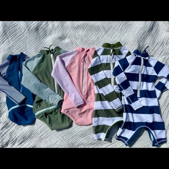 Brand new, long sleeve one piece swimsuit for kids. Has zipper in back for fast, easy potty breaks. For ages 1-4. Sizes 12m, 2T, 3T, 4T.Great for sun protection and potty training. Gender neutral/shorts style 2 colors- olive green and navy blueOriginal style colors- olive green, blush pink, navy blue