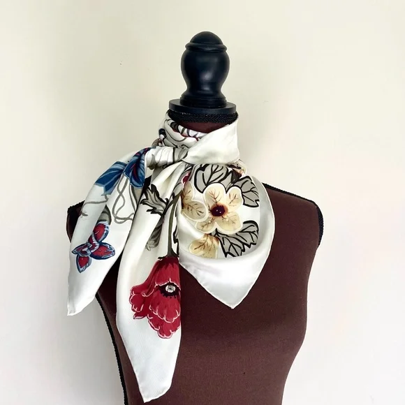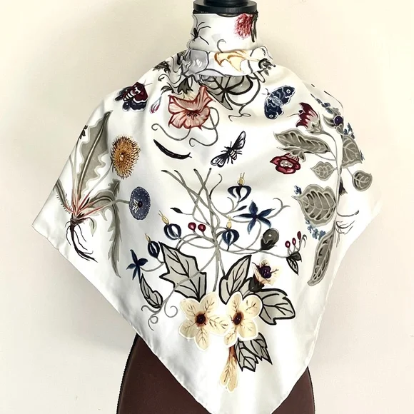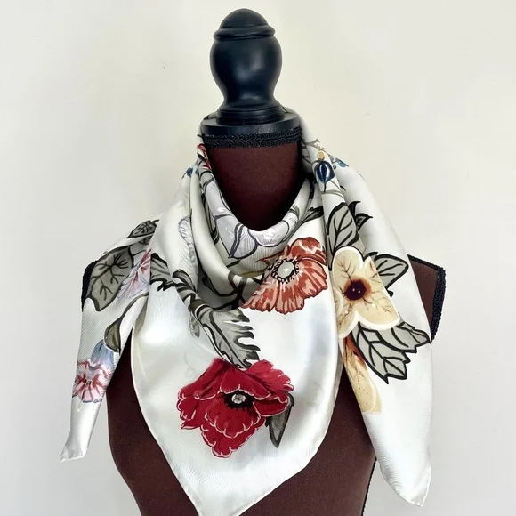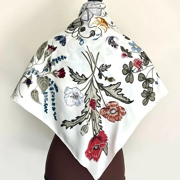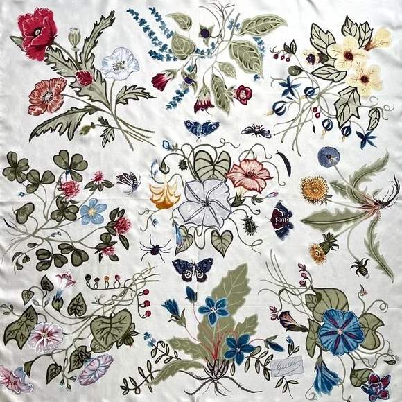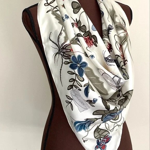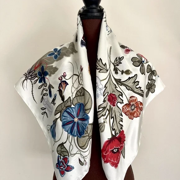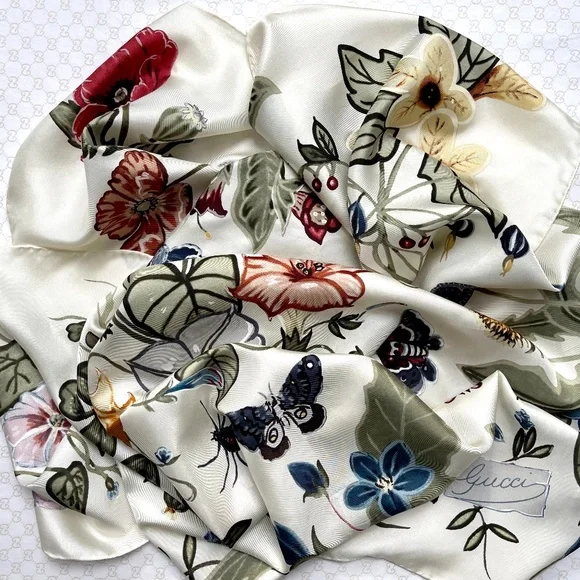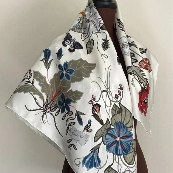 New Authentic Gucci Scarf Flora Knight Print Silk Scarf WrapNew withtags100% silk twillSquare shapeSize 35"x35" inchesHand Rolled edgesStyle # 371443Made in ItalyThe scarf comes with original Gucci Box. Perfect for Gift!Shipping with USPS Priority. Usually arrives within 2-3 business daysHow to wear Silk Scarf:As a silk head scarf/bandana: tied around as a silk head wrap for a classic look.As a neck scarf: wear it around the neck - tie a bow or let the end hang loose. As a body accessory: wear around your wrist like a bracelet. As a top: wrap around your body to make a beautiful silk tube top, tie it in the front or at the back, paired with jeans.As a silk belt: wear around high-waisted pants.As a silk scarf for bag: tie around or to the handle of your favorite bag for a classic look.Style it any way you want in your own mood and creativity!